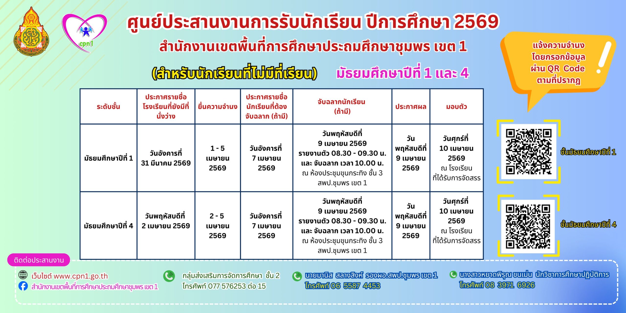 - ประกาศ อ.ก.ค.ศ.เขตพื้นที่การศึกษาประถมศึกษาชุมพร เขต 1 เรื่องการขึ้นบัญชีและการยกเลิกบัญชีผู้สอบแข่งขันได้ในการสอบแข่งขันเพื่อบรรจุและแต่งตั้งบุคคลเข้ารับราชการเป็นข้าราชการครูและบุคลากรทางการศึกษา ตำแหน่งครูผู้ช่วย สังกัด สพฐ. ปี พ.ศ.2568