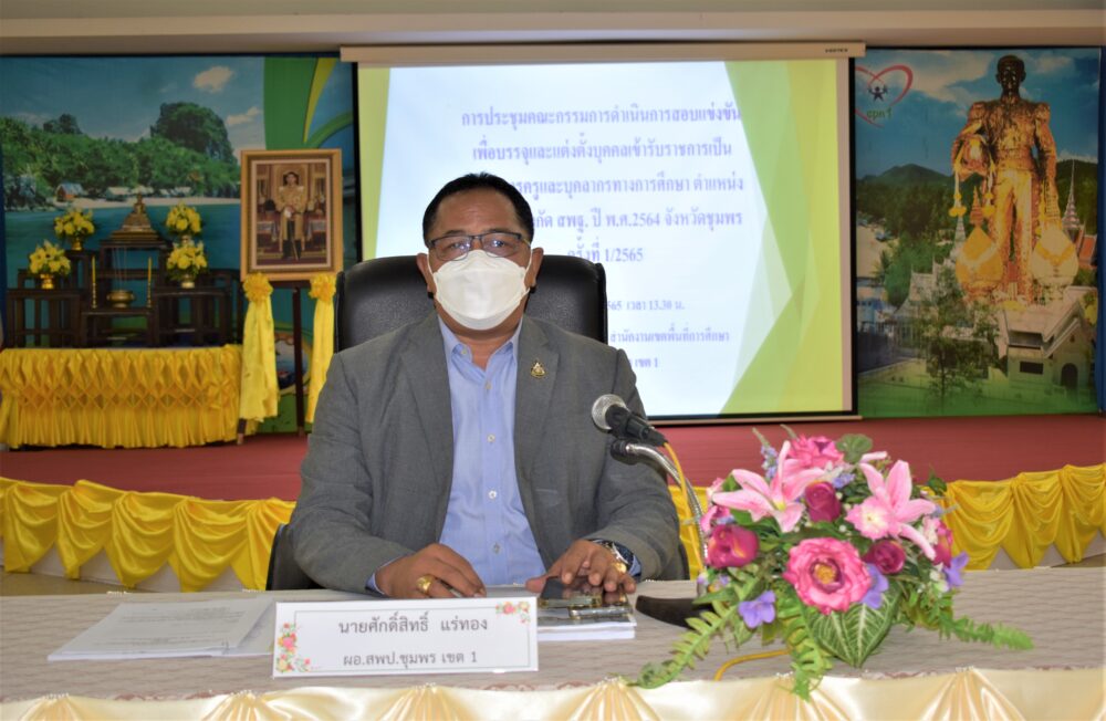 วันที่ 1 กุมภาพันธ์ 2565 เวลา 13.30 น. นายศักดิ์สิทธิ์ แร่ทอง ผู้อำนวยการสำนักงานเขตพื้นที่การศึกษาประถมศึกษาชุมพร เขต 1 เป็นประธานการประชุมคณะกรรมการดำเนินการสอบแข่งขันเพื่อบรรจุบุคคลเข้ารับราชการเป็นข้าราชการครูและบุคลากรทางการศึกษา ตำแหน่งครูผู้ช่วย สังกัด สพฐ. ปี พ.ศ.2564 ณ ห้องประชุมขุนกระทิง 1 ชั้น 3 สพป.ชุมพร เขต 1 เพื่อมอบหมายภารกิจให้คณะกรรมการของฝ่ายต่างๆ ในการเตรียมความพร้อมปฏิบัติหน้าที่ตามที่ได้รับมอบหมาย พร้อมได้ชี้แจงแนวปฏิบัติการดำเนินการจัดสอบฯ ให้เป็นไปด้วยความเรียบร้อย บริสุทธิ์ ยุติธรรม โปร่งใส และเป็นไปตามมาตรฐานการปฏิบัติด้านสาธารณสุข เพื่อป้องกันการแพร่ระบาดของโรคติดเชื้อไวรัสโคโรนา 2019 (COVID – 19) เนื่องจากคณะกรรมการมีจำนวนหลายฝ่าย ในวันนี้ จึงได้กำหนดจัดประชุมคณะกรรมการ จำนวน 8 ฝ่าย ผู้เข้าประชุม จำนวน 60 คน และจะมีการประชุมคณะกรรมการฝ่ายที่เหลืออีก 7 คณะ ในวันที่ 2 และ 4 กุมภาพันธ์ 2565 ต่อไป.-