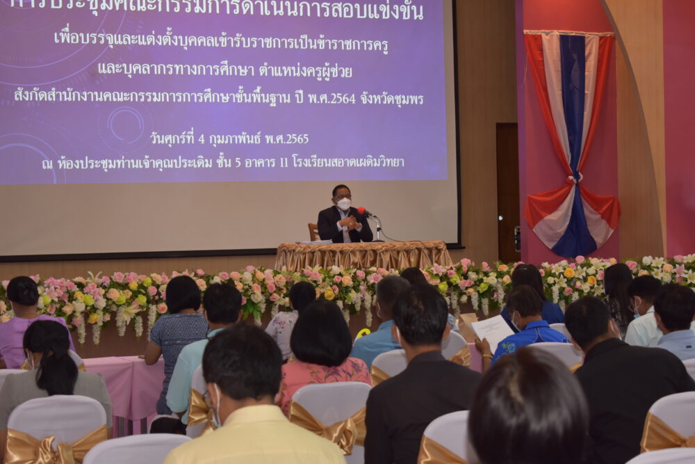 วันที่ 4 กุมภาพันธ์ 2565 เวลา 09.00 น. นายศักดิ์สิทธิ์ แร่ทอง ผอ.สพป.ชุมพร เขต 1 เป็นประธานการประชุมคณะกรรมการดำเนินการสอบแข่งขันเพื่อบรรจุบุคคลเข้ารับราชการเป็นข้าราชการครูและบุคลากรทางการศึกษา ตำแหน่งครูผู้ช่วย สังกัด สพฐ. ปี พ.ศ.2564 เพื่อชี้แจงแนวปฏิบัติการดำเนินการจัดสอบฯ เพื่อให้เป็นไปด้วยความเรียบร้อย บริสุทธิ์ ยุติธรรม โปร่งใส สามารถตรวจสอบได้ และเป็นไปตามมาตรฐานการปฏิบัติด้านสาธารณสุข เพื่อป้องกันการแพร่ระบาดของโรคติดเชื้อไวรัสโคโรนา 2019 (COVID – 19) ซึ่งในวันนี้ เป็นการประชุมคณะกรรมการ 4 ฝ่าย ได้แก่ คณะกรรมการกำกับห้องสอบ คณะกรรมการดูแลสอดส่องประจำอาคารสอบ คณะกรรมการอำนวยการสอบ และเจ้าหน้าที่ฝ่ายพยาบาล ณ ห้องประชุมเจ้าคุณประเดิม ชั้น 5 อาคาร 11 โรงเรียนสอาดเผดิมวิทยา
