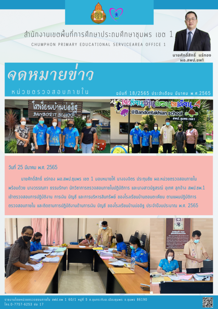 วันที่ 25 มีนาคม 2565 นายศักดิ์สิทธิ์ แร่ทอง ผอ.สพป.ชพ 1 มอบหมายให้ นางจงจิตร ประทุมชัย ผอ.หน่วยตรวจสอบภายใน พร้อมด้วย นางวรรณภา ธรรมรักษา นักวิชาการตรวจสอบภายในปฏิบัติการ และนางสาวนัฐสรณ์ อุเทศ ลูกจ้าง สพฟ.ชพ.1 เข้าตรวจสอบการปฏิบัติงานด้านการเงิน บัญชี และการบริหารสินทรัพย์ ของโรงเรียนบ้านดอนตะเคียน ตามแผนปฏิบัติการตรวจสอบภายใน และติดตามการปฏิบัติงานด้านการเงิน บัญชี ของโรงเรียนบ้านบ่ออิฐ ประจำปีงบประมาณ พ.ศ.2565