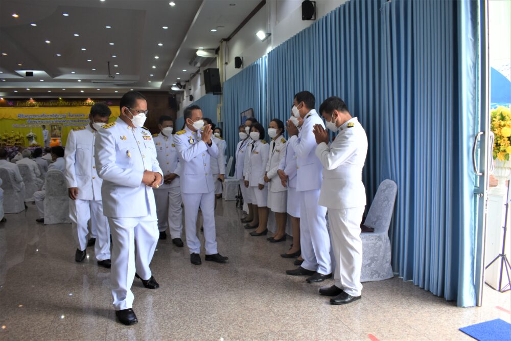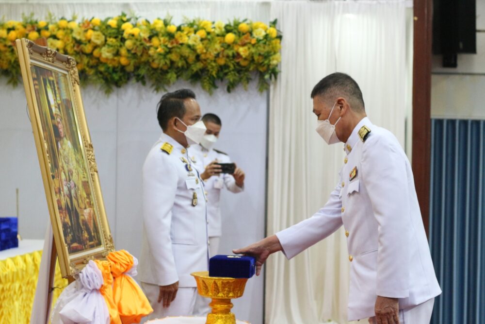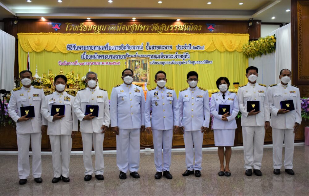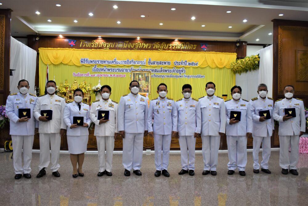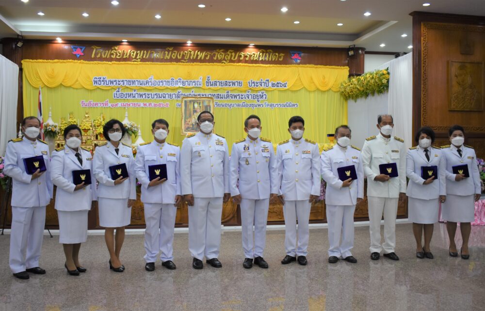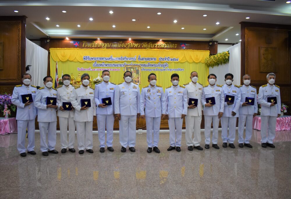 สพป.ชุมพร เขต 1 จัดพิธีรับพระราชทานเครื่องราชอิสริยาภรณ์ ชั้นสายสะพาย ประจำปี ๒๕๖๔ เบื้องหน้าพระบรมฉายาลักษณ์พระบาทสมเด็จพระเจ้าอยู่หัว