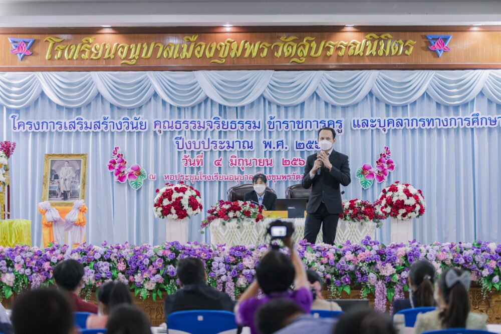 วันที่ 4 มิถุนายน 2565 เวลา 08.30 น. ณ หอประชุมโรงเรียนอนุบาลเมืองชุมพรวัดสุบรรณนิมิตร ดร.ศักดิ์สิทธิ์ แร่ทอง ผู้อำนวยการสำนักงานเขตพื้นที่การศึกษาประถมศึกษาชุมพร เขต 1 เป็นประธานพิธีเปิดอบรมพร้อมบรรยายพิเศษ โครงการอบรมเสริมสร้างวินัย คุณธรรม และจริยธรรม ข้าราชการครูและบุคลากรทางการศึกษา ปีงบประมาณ พ.ศ.2565 โดยมีนายสุทธิพันธ์ แสงขำ ปฏิบัติหน้าที่ผู้อำนวยการกลุ่มกฎหมายและคดี กล่าวรายงาน การอบรมในครั้งนี้ มีวัตถุประสงค์เพื่อเพิ่มพูนความรู้ ความเข้าใจในเรื่องวินัย คุณธรรม จริยธรรมเกี่ยวกับการประกอบวิชาชีพ ให้เป็นผู้มีความประพฤติที่ดีอยู่ในระเบียบวินัย มีความรับผิดชอบในการปฏิบัติหน้าที่ราชการ ไม่กระทำอันเป็นความผิดวินัยและจรรยาบรรณ ซึ่งผู้เข้าอบรมได้แก่ ข้าราชการครูที่รับการบรรจุและแต่งตั้งปีงบประมาณ พ.ศ.2564 และปีงบประมาณ พ.ศ.2565 จำนวน 152 คน และวิทยากรจากสำนักงานคณะกรรมการข้าราชการครูและบุคลากรทางการศึกษา เป็นผู้ให้ความรู้กับผู้เข้าอบรม โดยได้รับความอนุเคราะห์จากผู้บริหารโรงเรียนและคณะครูของโรงเรียนอนุบาลเมืองชุมพรวัดสุบรรณมิตรในการอำนวยความสะดวก และสถานที่จัดอบรม.-