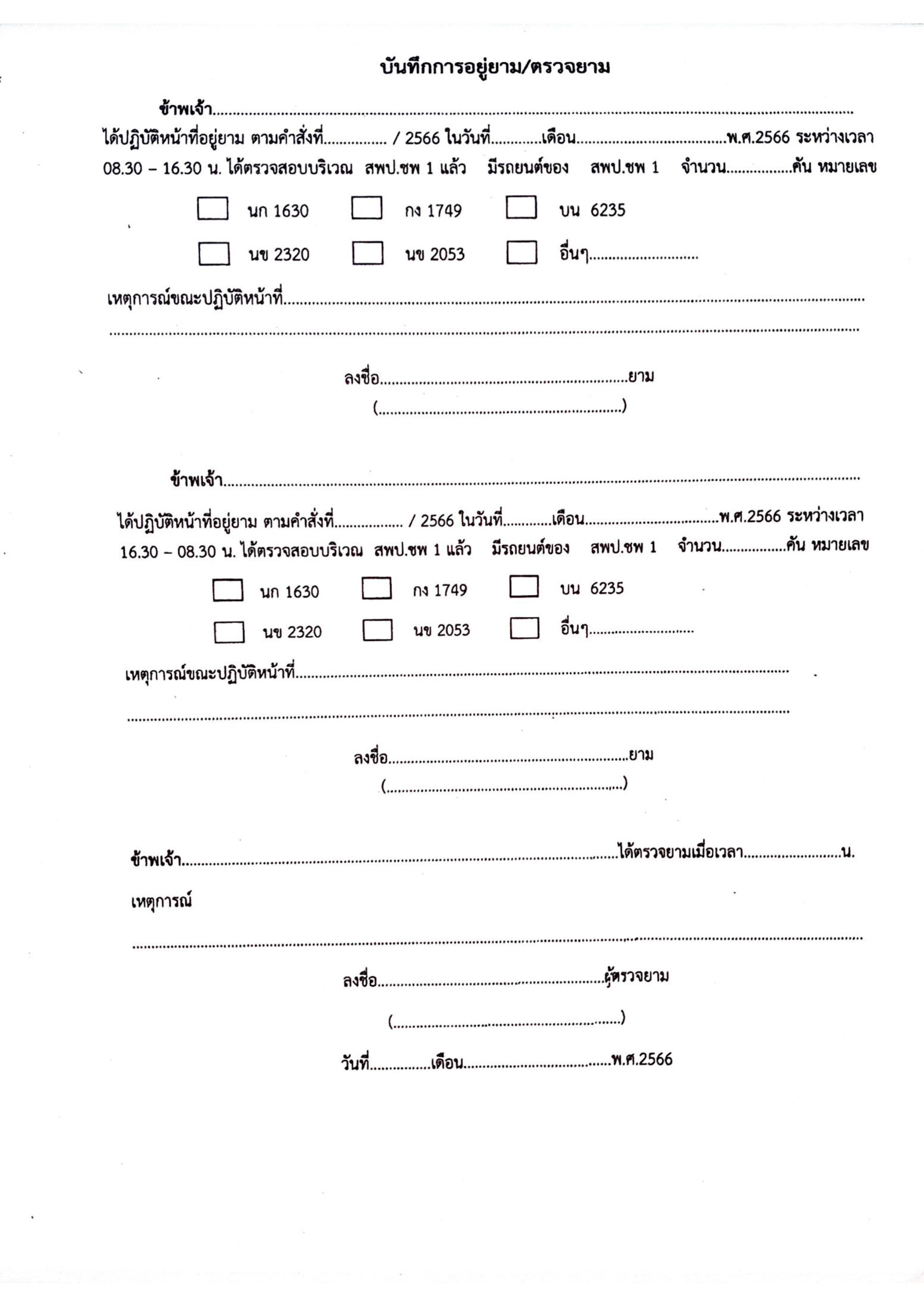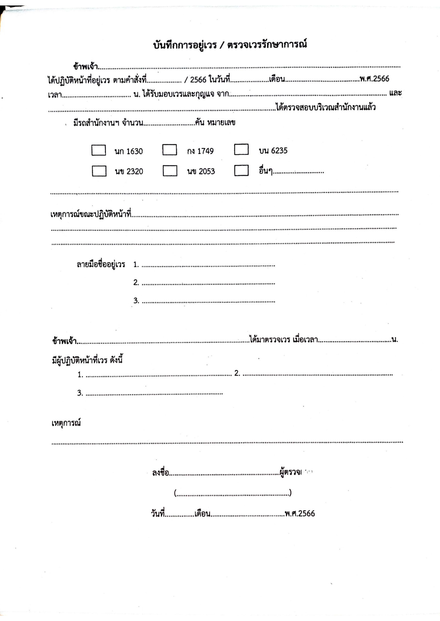 3.3 ให้เวรยามในตอนกลางคืนและในวันหยุดราชการตรวจสอบและบันทึกด้วยว่าในขณะปฏิบัติหน้าที่มีรถราชการจำนวนเท่าใดและเลขทะเบียนใด