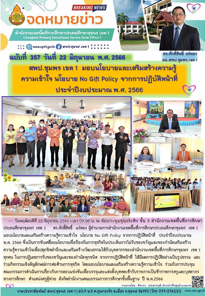 3. จัดกิจกรรมมอบนโยบายและเสริมสร้างความรู้ความเข้าใจนโยบาย No Gift Policy ประจำปีงบประมาณ พ.ศ. 2566