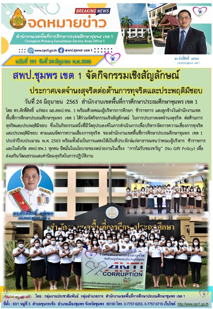 วันศุกร์ที่ 24 มิถุนายน พ.ศ. 2565 สำนักงานเขตพื้นที่การศึกษาประถมศึกษาชุมพร เขต 1 โดย ดร.ศักดิ์สิทธิ์ แร่ทอง ผอ.สพป.ชพ. 1 พร้อมด้วยคณะผู้บริหารการศึกษา ข้าราชการ และบุคลากรผู้ปฏิบัติงานในสังกัดทุกคน ได้ร่วมจัดกิจกรรมเชิงสัญลักษณ์ ในการประกาศเจตจำนงสุจริต ต่อต้านการทุจริตและประพฤติมิชอบ ซึ่งเป็นกิจกรรมหนึ่งที่มีวัตถุประสงค์ในการดำเนินการเพื่อบริหารจัดการความเสี่ยงการทุจริตและประพฤติมิชอบ ตามแผนจัดการความเสี่ยงการทุจริต ของสำนักงานเขตพื้นที่การศึกษาประถมศึกษาชุมพร เขต 1 ประจำปีงบประมาณ พ.ศ. 2565 พร้อมทั้งยังเป็นการแสดงให้เป็นที่ประจักษ์แก่สาธารณชนว่าคณะผู้บริหาร ข้าราชการ และบุคลากรในสังกัด สพป.ชพ.1 ทุกคน ยึดมั่นในนโยบายของหน่วยงานในเรื่อง "การไม่รับของขวัญ" (No Gift Policy) เพื่อส่งเสริมวัฒนธรรมและค่านิยมสุจริตในการปฏิบัติงาน