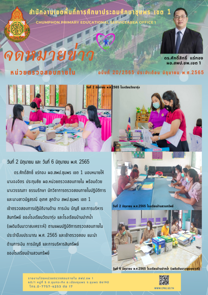 วันที่ 2 มิถุนายน และ 6 มิถุนายน 2565 นายศักดิ์สิทธิ์ แร่ทอง ผอ.สพป.ชพ 1 มอบหมายให้ นางจงจิตร ประทุมชัย ผอ.หน่วยตรวจสอบภายใน พร้อมด้วย นางวรรณภา ธรรมรักษา นักวิชาการตรวจสอบภายในปฏิบัติการ และนางสาวนัฐสรณ์ อุเทศ ลูกจ้าง สพฟ.ชพ.1 เข้าตรวจสอบการปฏิบัติงานด้านการเงิน บัญชี และการบริหารสินทรัพย์ ของโรงเรียนบ้านปากน้ำ (เผดิมจีนนาวาสงเคราะห์) ตามแผนปฏิบัติการตรวจสอบภายใน ประจำปีงบประมาณ พ.ศ.2565 และแนะนำการปฏิบัติงานด้านการเงิน บัญชี ของโรงเรียนบ้านสวนทรัพย์