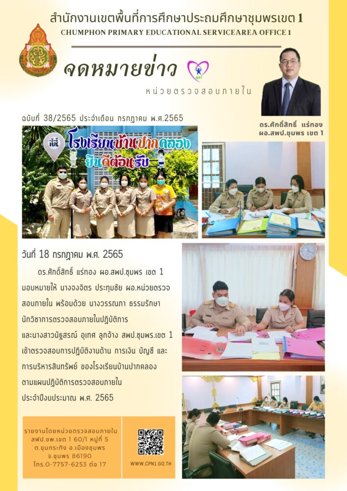 วันที่ 18 – 19 กรกฎาคม 2565 หน่วยตรวจสอบภายใน สพป.ชุมพร เขต 1 ลงพื้นที่ตรวจสอบการปฏิบัติงานด้านการเงิน บัญชี และการบริหารสินทรัพย์ ของโรงเรียนบ้านปากคลอง และโรงเรียนวัดดอนเมือง ตามแผนปฏิบัติการตรวจสอบภายใน ประจำปีงบประมาณ พ.ศ. 2565 19 กรกฎาคม 256519 กรกฎาคม 2022 หน่วยตรวจสอบภายใน สพป.ชพ.1 ข่าวและกิจกรรมหน่วยตรวจสอบภายใน FacebookFacebookXXLINELine หน่วยตรวจสอบภายใน สพป.ชพ.1