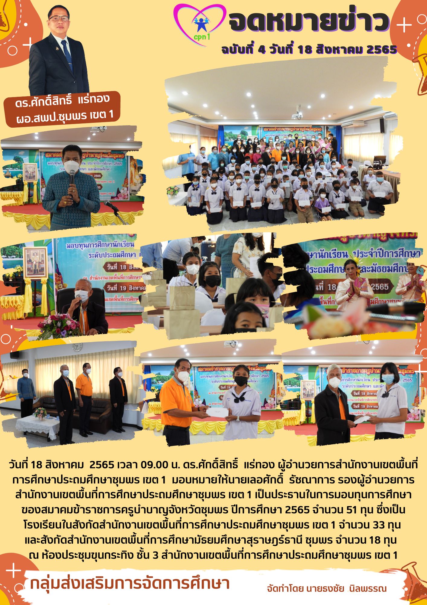วันที่ 18 สิงหาคม 2565 เวลา 09.00 น. ดร.ศักดิ์สิทธิ์ แร่ทอง ผู้อำนวยการสำนักงานเขตพื้นที่การศึกษาประถมศึกษาชุมพร เขต 1 มอบหมายให้นายเลอศักดิ์ รัชณาการ รองผู้อำนวยการสำนักงานเขตพื้นที่การศึกษาประถมศึกษาชุมพร เขต 1 เป็นประธานในการมอบทุนการศึกษาของสมาคมข้าราชการครูบำบาญจังหวัดชุมพร ปีการศึกษา 2565 จำนวน 51 ทุน ซึ่งเป็นโรงเรียนในสังกัดสำนักงานเขตพื้นที่การศึกษาประถมศึกษาชุมพร เขต 1 จำนวน 33 ทุน และสังกัดสำนักงานเขตพื้นที่การศึกษามัธยมศึกษาสุราษฎร์ธานี ชุมพร จำนวน 18 ทุน ณ ห้องประชุมขุนกระทิง ชั้น 3 สำนักงานเขตพื้นที่การศึกษาประถมศึกษาชุมพร เขต 1