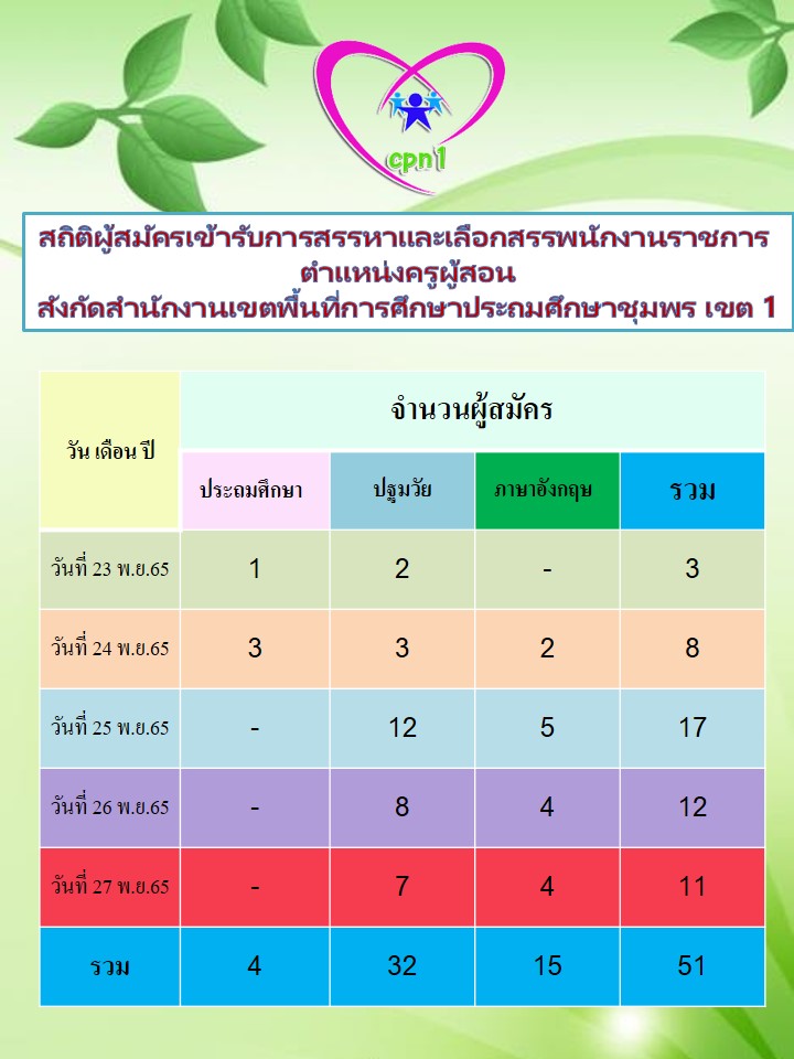 สถิติผู้สมัครเข้ารับการสรรหาและเลือกสรรพนักงานราชการ ตำแหน่งครูผู้สอน สังกัดสำนักงานเขตพื้นที่การศึกษาประถมศึกษาชุมพร เขต 1 24 พฤศจิกายน 256527 พฤศจิกายน 2022 กลุ่มบริหารงานบุคคล สพป.ชพ.1 ข่าวและกิจกรรมกลุ่มบริหารงานบุคคล, ประกาศรับสมัครงาน FacebookFacebookXXLINELine กลุ่มบริหารงานบุคคล สพป.ชพ.1