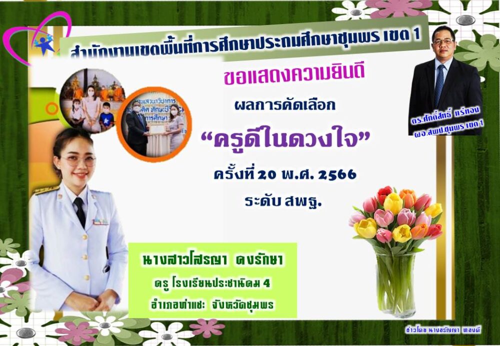 ขอแสดงความยินดี ผลการคัดเลือก “ครูดีในดวงใจ” ครั้งที่ 20 พ.ศ. 2566 ระดับ สพฐ. 09 ธันวาคม 256509 ธันวาคม 2022 กลุ่มพัฒนาครูและบุคลากรทางการศึกษา สพป.ชพ.1 ข่าวและกิจกรรมกลุ่มพัฒนาครูและบุคลากรทางการศึกษา, งานยกย่องเชิดชูเกียรติ/คัดเลือกรางวัล FacebookFacebookXXLINELine กลุ่มพัฒนาครูและบุคลากรทางการศึกษา สพป.ชพ.1