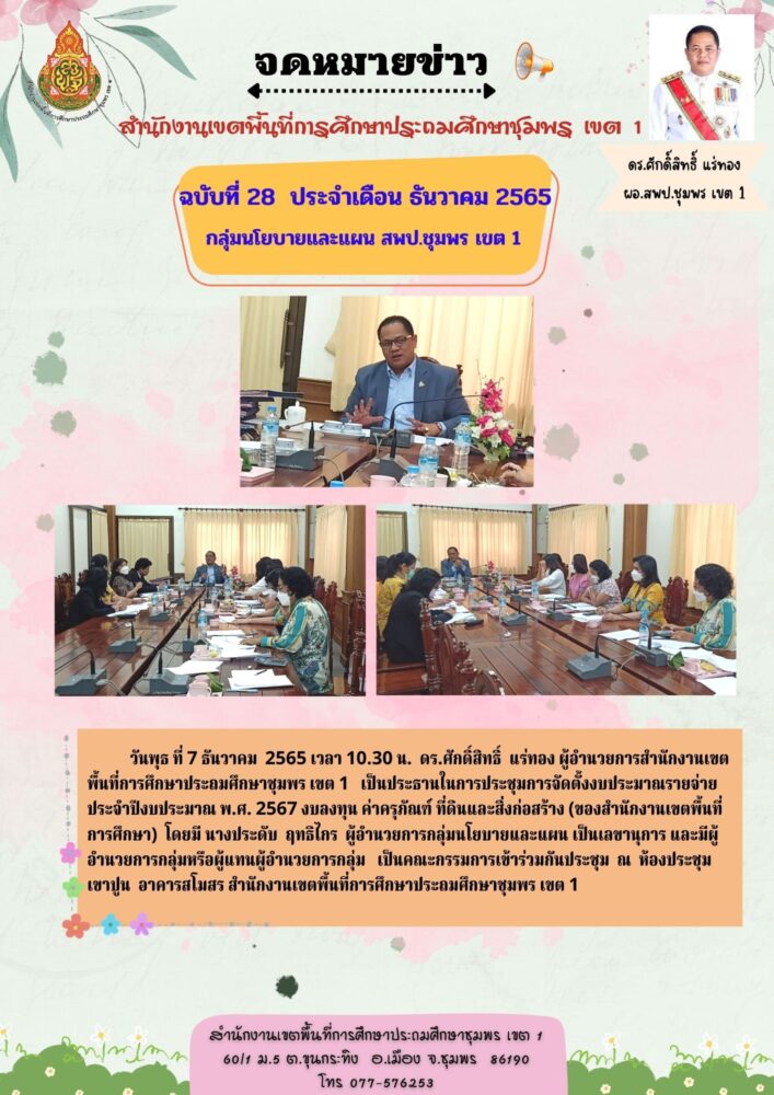 ประชุมการจัดตั้งงบประมาณรายจ่ายประจำปีงบประมาณ พ.ศ. 2567 งบลงทุน ค่าครุภัณฑ์ ที่ดินและสิ่งก่อสร้าง (ของ สพท).) 13 ธันวาคม 2565 กลุ่มนโยบายและแผน - ข่าวกิจกรรมกลุ่มนโยบายและแผน FacebookFacebookXXLINELine กลุ่มนโยบายและแผน -