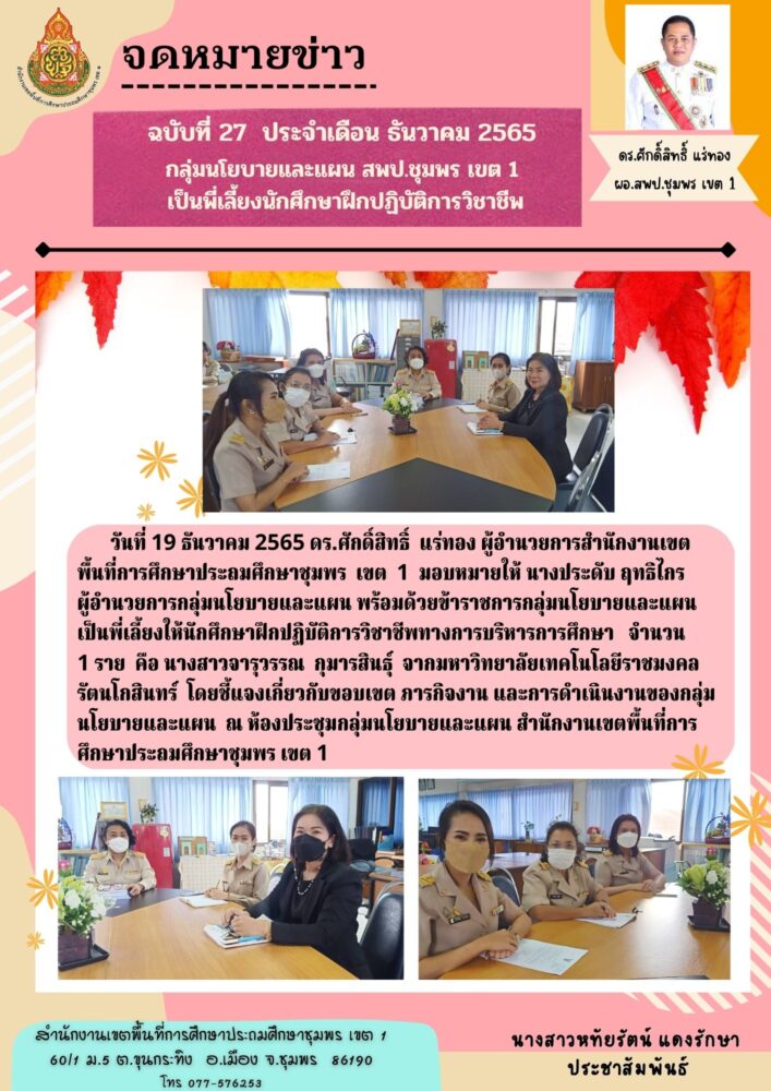 กลุ่มนโยบายและแผน สพป.ชุมพร เขต 1 เป็นพี่เลี้ยงนักศึกษาฝึกปฏิบัติการวิชาชีพ 20 ธันวาคม 2565 กลุ่มนโยบายและแผน - ข่าวกิจกรรมกลุ่มนโยบายและแผน FacebookFacebookXXLINELine กลุ่มนโยบายและแผน -