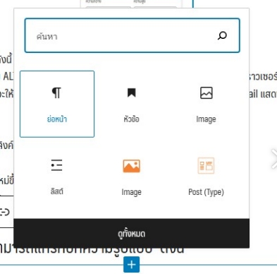 - คลิกเลือกบล็อก ย่อหน้า หรือกรอกคำว่า ย่อหน้า ในช่องค้นหาบล็อกก็ได้ แล้วคลิกเลือกบล็อก ย่อหน้า