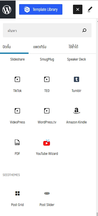 - คลิกเลือกบล็อก PDF หรือกรอกคำว่า PDF ในช่องค้นหาบล็อกก็ได้ แล้วคลิกเลือกบล็อก PDF