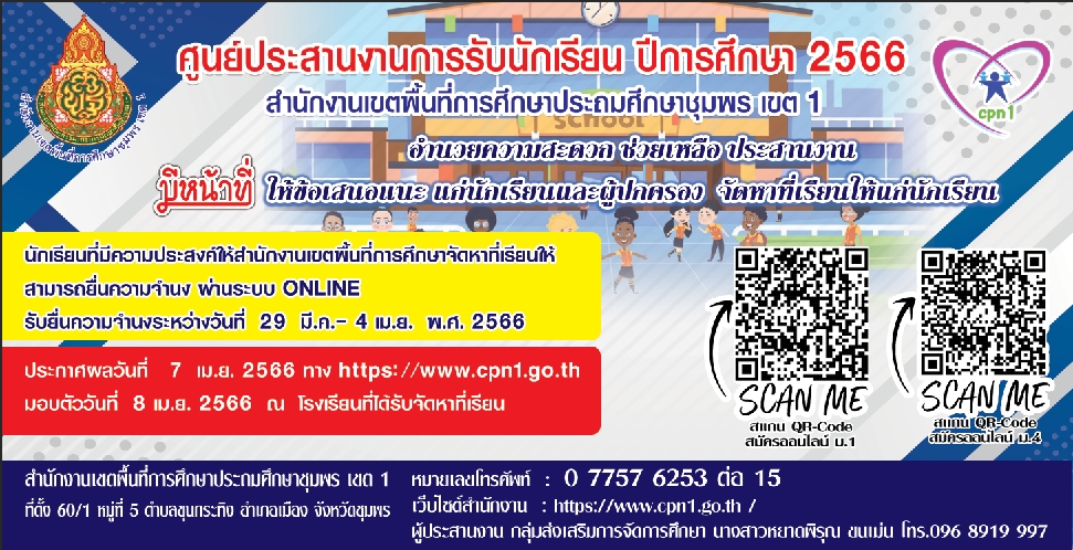 ศูนย์ประสานงานการรับนักเรียน ปีการศึกษา 2566 สำนักงานเขตพื้นที่การศึกษาประถมศึกษาชุมพร เขต 1