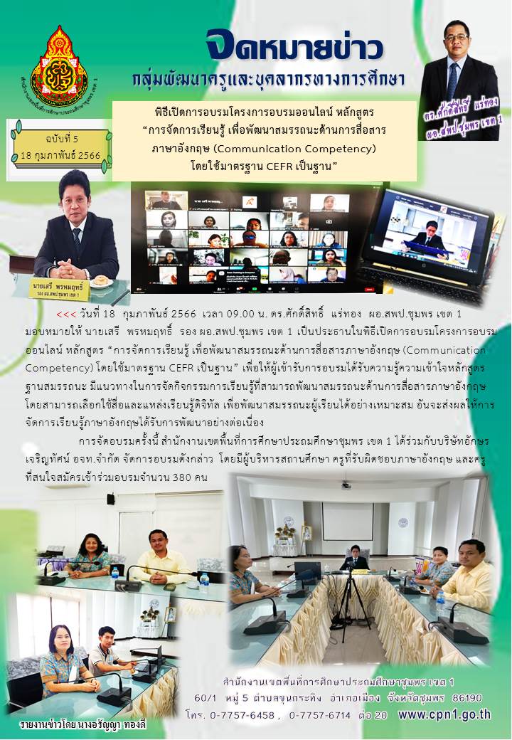 จดหมายข่าว กลุ่มพัฒนาครู ฉบับที่ 5พิธีเปิดการอบรมออนไลน์หลักสูตรการจัดการเรียนรู้ด้านการสื่อสารภาษาอังกฤษฯ 19 กุมภาพันธ์ 256619 กุมภาพันธ์ 2023 กลุ่มพัฒนาครูและบุคลากรทางการศึกษา สพป.ชพ.1 กลุ่มพัฒนาครูและบุคลากรทางการศึกษา, งานยกย่องเชิดชูเกียรติ/คัดเลือกรางวัล FacebookFacebookXXLINELine กลุ่มพัฒนาครูและบุคลากรทางการศึกษา สพป.ชพ.1