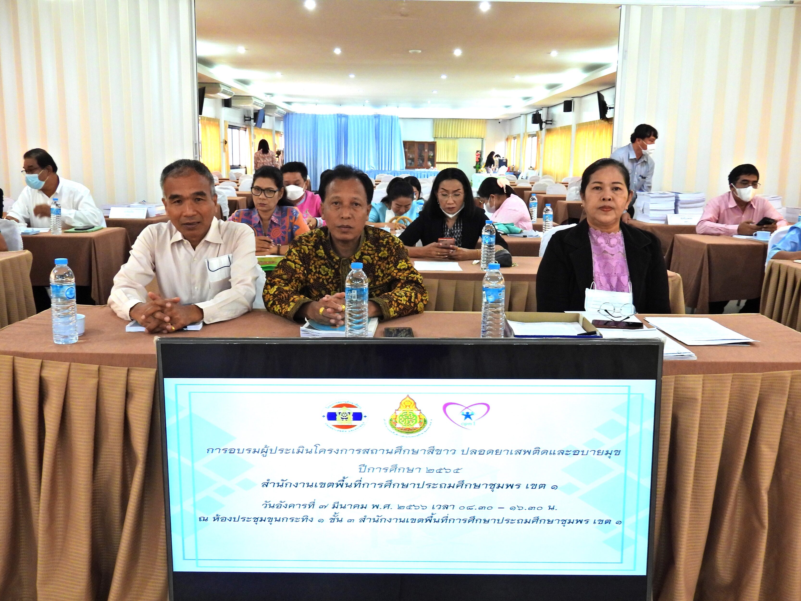 วันที่ 7 มีนาคม 2566 เวลา 09.00 น. ดร.ศักดิ์สิทธิ์ แร่ทอง ผู้อำนวยการสำนักงานเขตพื้นที่การศึกษาประถมศึกษาชุมพร เขต 1 เป็นประธานเปิดการอบรมผู้ประเมินโครงการสถานศึกษาสีขาว ปลอดยาเสพติดและอบายมุข ปีการศึกษา 2565 โดยมีวัตถุประสงค์เพื่อให้ผู้ประเมินฯที่เข้ารับการอบรม จำนวน 30 คน มีความรู้ ความเข้าใจในการดำเนินงาน ตลอดจนพัฒนาสมรรถะการทำงานให้กับผู้ประเมินฯ ณ ห้องประชุมขุนกระทิง 1 ชั้น 3 สพป.ชุมพร เขต 1.-