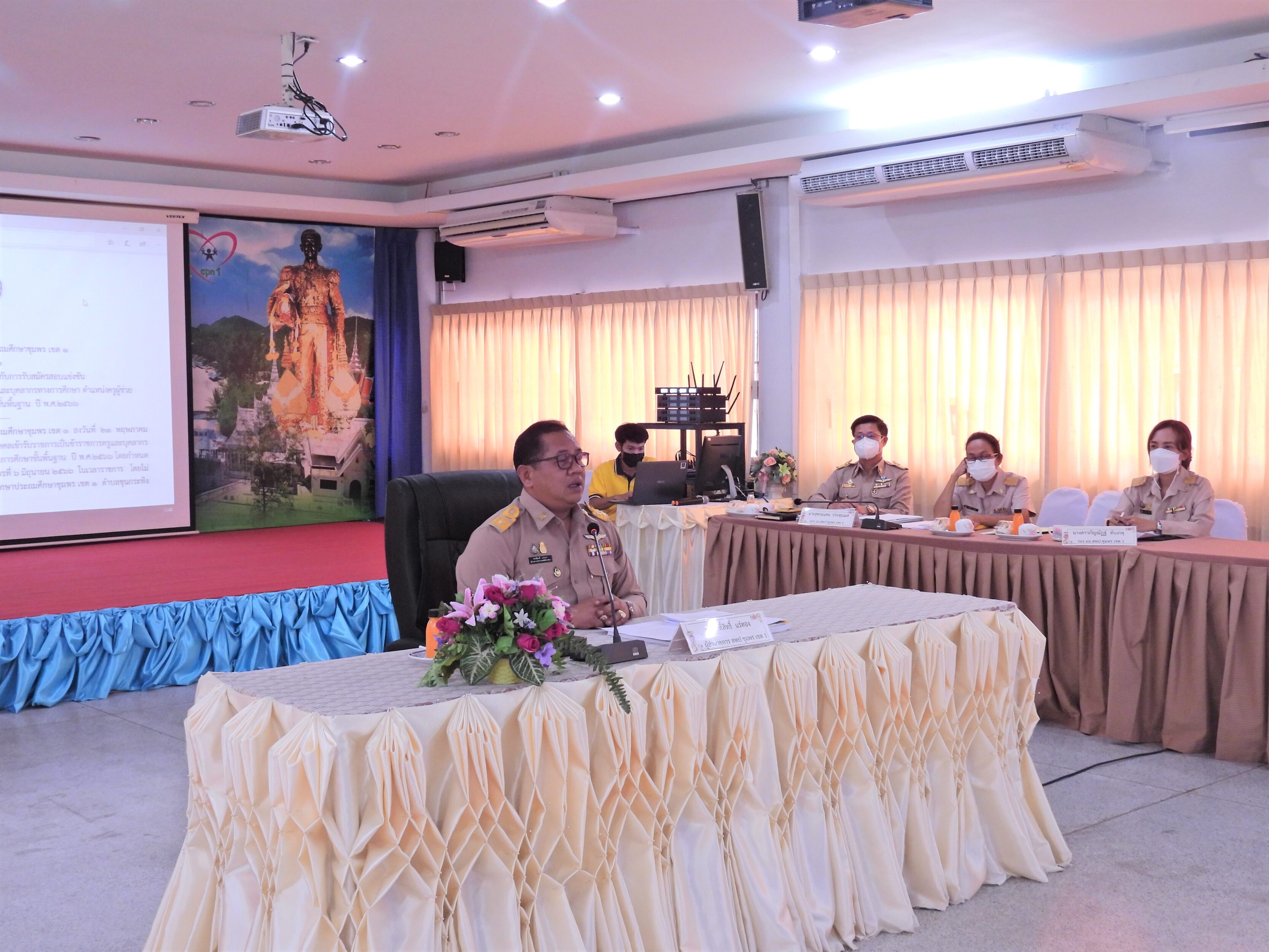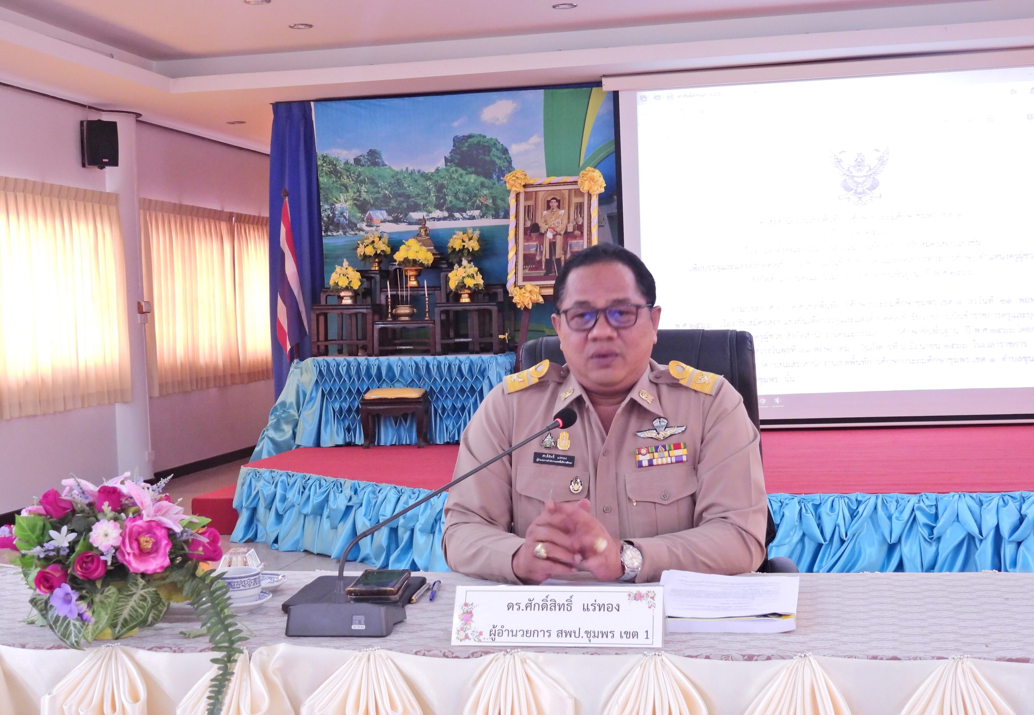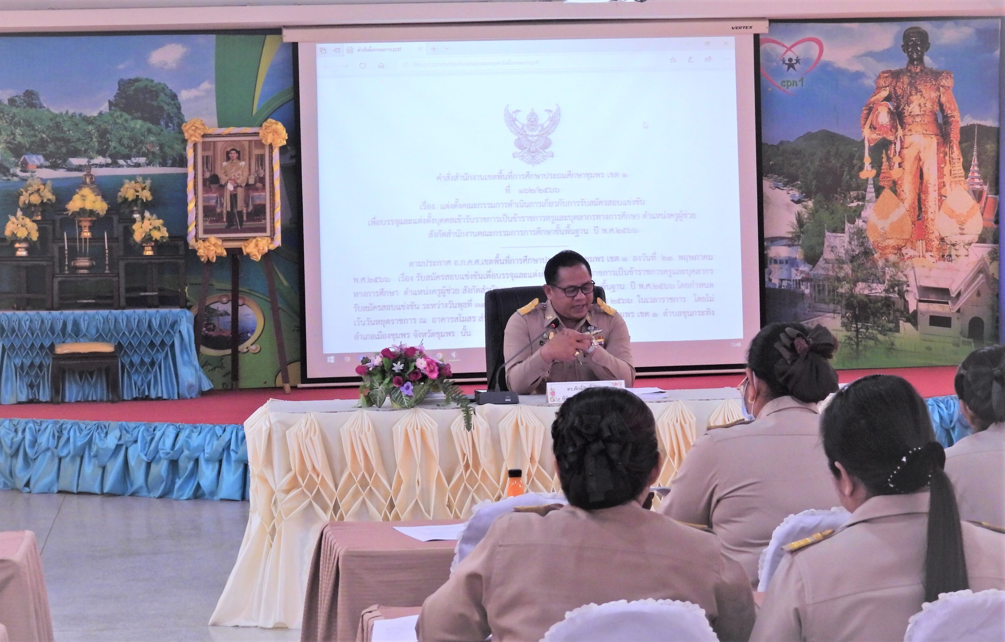 ดร.ศักดิ์สิทธิ์ แร่ทอง ผู้อำนวยการสำนักงานเขตพื้นที่การศึกษาประถมศึกษาชุมพร เขต 1 เป็นประธานในการประชุมคณะกรรมการดำเนินการรับสมัครสอบแข่งขันเพื่อบรรจุและแต่งตั้งบุคคลเข้ารับราชการเป็นข้าราชการครูและบุคลากรทางการศึกษา ตำแหน่งครูผู้ช่วย สังกัด สพฐ. ปี พ.ศ. 2566 ครั้งที่ 1/2566 เพื่อชี้แจงการดำเนินการเกี่ยวกับการปฏิบัติหน้าที่ในการรับสมัครสอบแข่งขันเพื่อบรรจุและแต่งตั้งบุคคลเข้ารับราชการเป็นข้าราชการครูและบุคลากรทางการศึกษา ตำแหน่งครูผู้ช่วย สังกัด สพฐ. ปี พ.ศ.2566 ให้การปฏิบัติหน้าที่ของคณะกรรมการฝ่ายต่างๆ ให้เป็นไปด้วยความเรียบร้อย และปฏิบัติหน้าที่ได้ถูกต้องตรงกันตามประกาศรับสมัคร โดยมีนายสุพรมแดน ประทุมเมศ รอง ผอ.สพป.ชุมพร เขต 1 ร่วมชี้แจงรายละเอียดต่อที่ประชุมในครั้งนี้ด้วย.>>