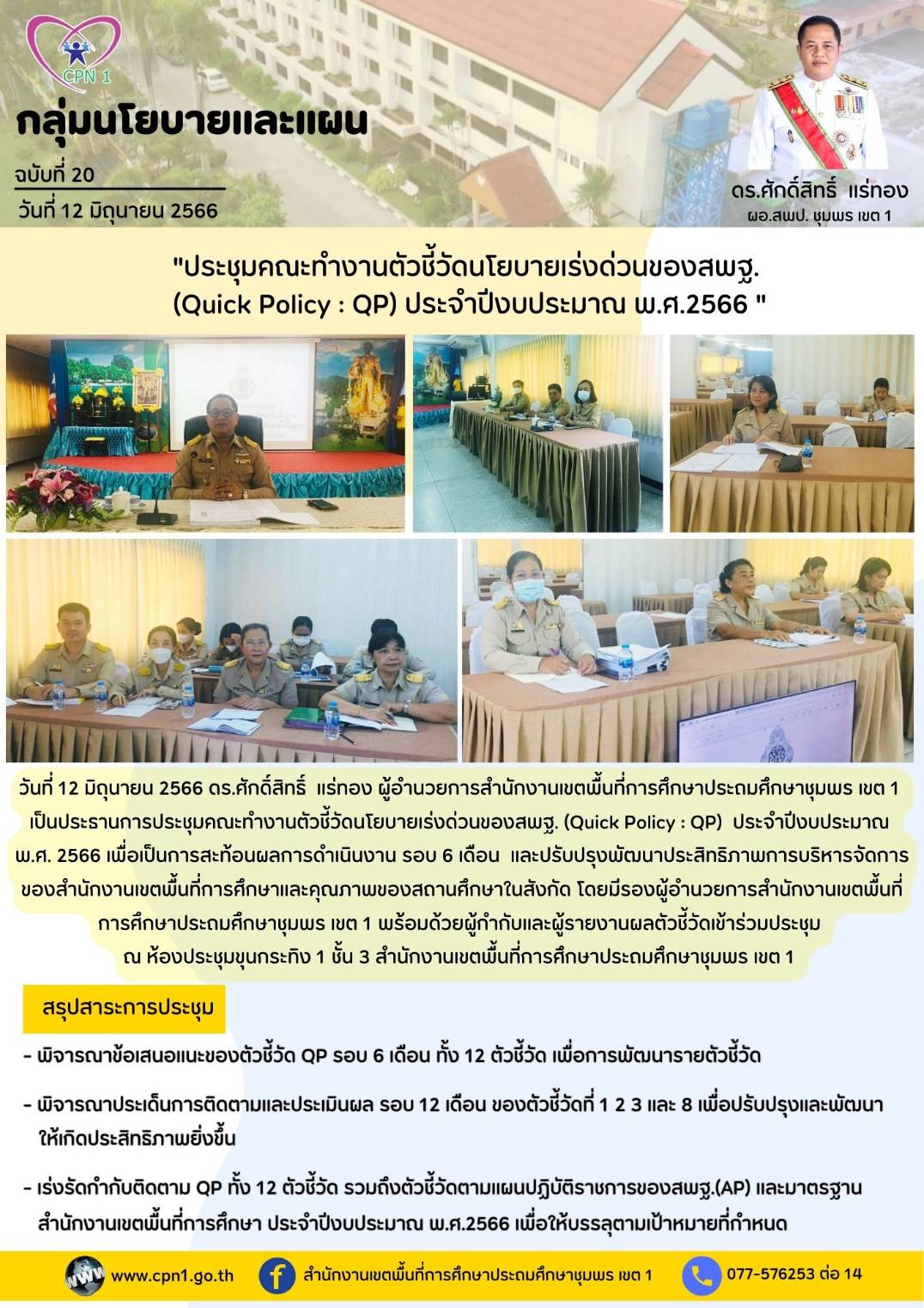 ประชุมคณะทำงานตัวชี้วัดนโยบายเร่งด่วนของ สพฐ.(Quick Policy:QP) ประจำปีงบประมาณ 2566 13 มิถุนายน 256614 มิถุนายน 2023 กลุ่มนโยบายและแผน - ข่าวกิจกรรมกลุ่มนโยบายและแผน, ข่าวและกิจกรรม สพป.ชพ.1 FacebookFacebookXXLINELine กลุ่มนโยบายและแผน -