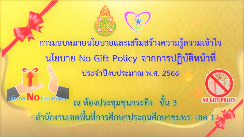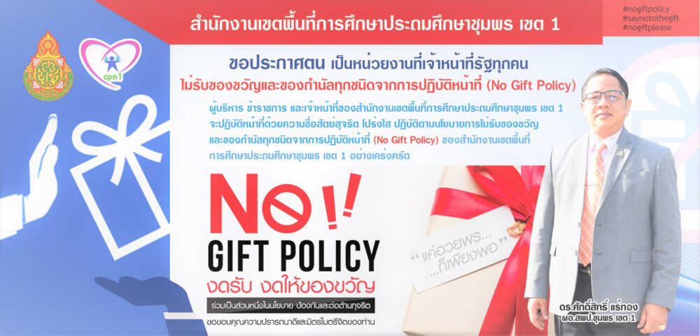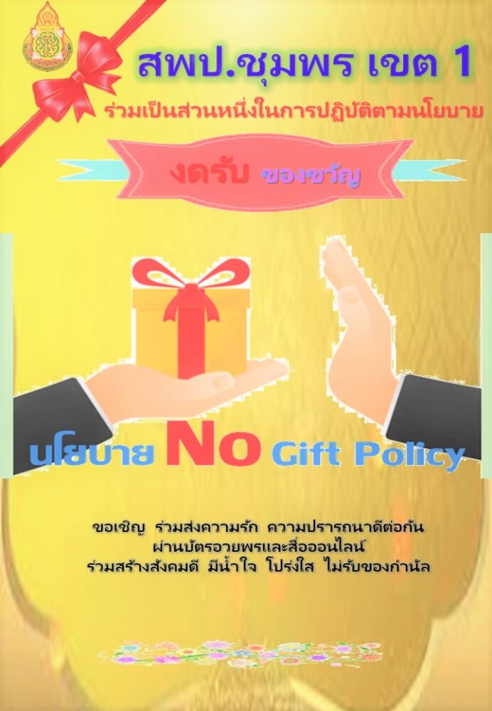ผู้บริหารการศึกษา ข้าราชการครูและบุคลากรทางการศึกษาและบุคลากร ของสำนักงานเขตพื้นที่การศึกษาชุมพร เขต 1 ทุกคน จะต้องไม่รับของของขวัญและของกํานัลทุกชนิดจากการปฏิบัติหน้าที่(No Gift Policy) ทั้งในก่อนขณะหรือหลังจากการปฏิบัติหน้าที่ที่จะส่งผลให้เกิดการทุจริตและประพฤติมิชอบ เพื่อให้การปฏิบัติหน้าที่เป็นไปอย่างเที่ยงธรรมและไม่เกิดผลประโยชน์ทับซ้อน หรือส่งผลกระทบต่อความเป็นอิสระในการตัดสินใจให้เปลี่ยนแปลงไปในทางทุจริตและประพฤติมิชอบ