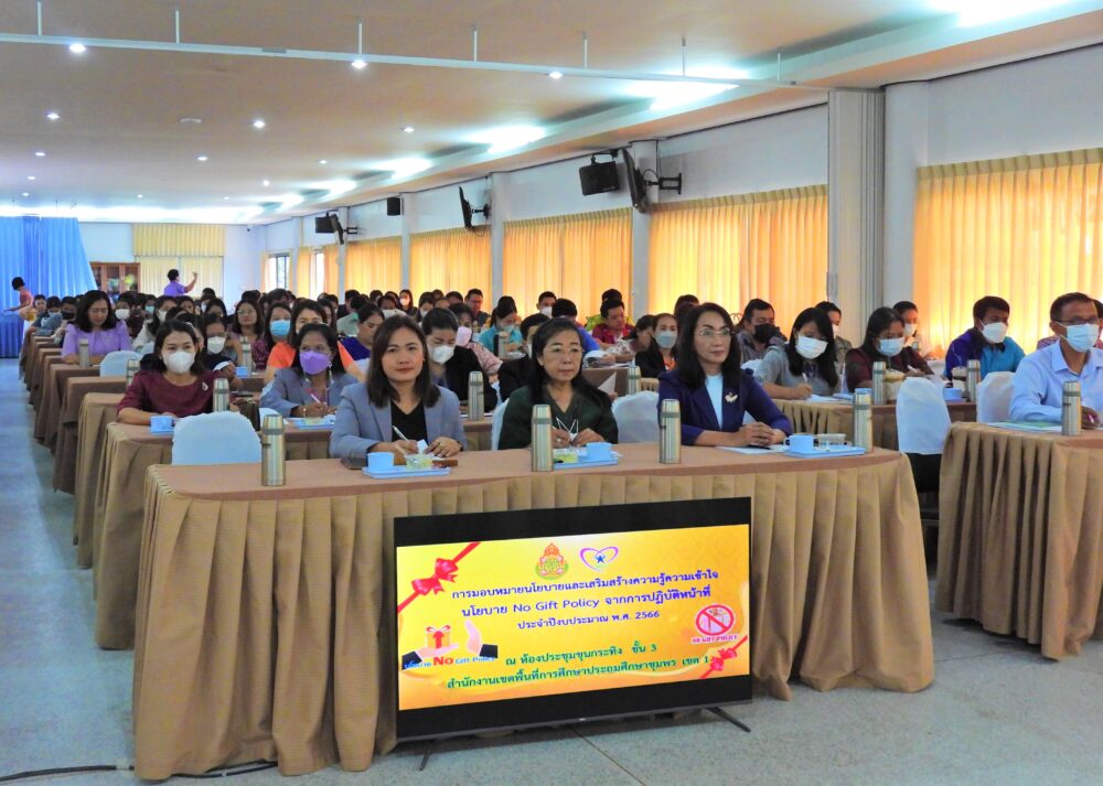 .>ดร.ศักดิ์สิทธิ์ แร่ทอง ผู้อำนวยการสำนักงานเขตพื้นที่การศึกษาประถมศึกษาชุมพร เขต 1 มอบนโยบายและเสริมสร้างความรู้ความเข้าใจ นโยบาย No Gift Policy จากการปฏิบัติหน้าที่ ประจําปีงบประมาณ พ.ศ. 2566 ซึ่งเป็นการขับเคลื่อนนโยบายเพื่อป้องกันการทุจริตในประเด็นการไม่รับของขวัญและของกํานัล เสริมสร้างความรู้ความเข้าใจเพื่อปลุกจิตสํานึกและเสริมสร้างวัฒนธรรมให้กับบุคลากรของสำนักงานเขตพื้นที่การศึกษาชุมพร เขต 1 จำนวน 68 คน และผู้บริหารสถานศึกษาในสังกัดจำนวน 107 คน ในการปฏิเสธการรับของขวัญและของกํานัลทุกชนิด จากการปฏิบัติหน้าที่ ให้มีผลการปฏิบัติอย่างเป็นรูปธรรม และร่วมกิจกรรมเชิงสัญลักษณ์การต่อต้านการทุจริต โดยมอบนโยบายและเสริมสร้างความรู้ความเข้าใจ ณ ห้องประชุมขุนกระทิง ชั้น 3 สํานักงานเขตพื้นที่การศึกษาประถมศึกษาชุมพร เขต 1 ดังนี้
