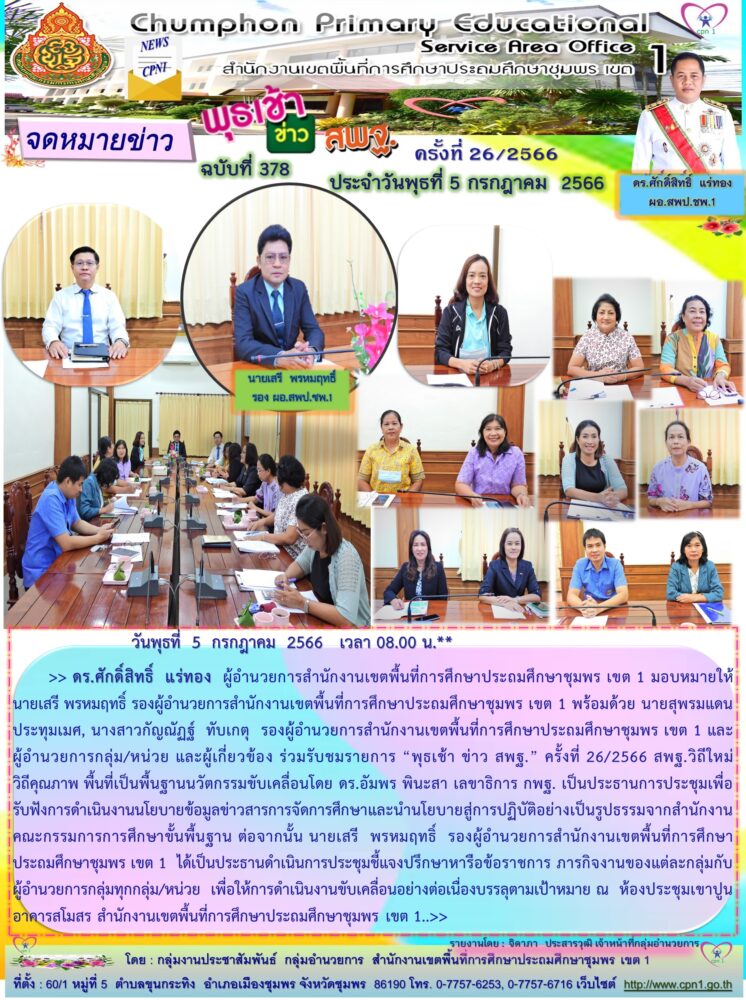 >> ดร.ศักดิ์สิทธิ์ แร่ทอง ผู้อำนวยการสำนักงานเขตพื้นที่การศึกษาประถมศึกษาชุมพร เขต 1 มอบหมายให้ นายเสรี พรหมฤทธิ์ รองผู้อำนวยการสำนักงานเขตพื้นที่การศึกษาประถมศึกษาชุมพร เขต 1 พร้อมด้วย นายสุพรมแดน ประทุมเมศ, นางสาวกัญณัฏฐ์ ทับเกตุ รองผู้อำนวยการสำนักงานเขตพื้นที่การศึกษาประถมศึกษาชุมพร เขต 1 และผู้อำนวยการกลุ่ม/หน่วย และผู้เกี่ยวข้อง ร่วมรับชมรายการ "พุธเช้า ข่าว สพฐ." ครั้งที่ 26/2566 สพฐ.วิถีใหม่ วิถีคุณภาพ พื้นที่เป็นพื้นฐานนวัตกรรมขับเคลื่อนโดย ดร.อัมพร พินะสา เลขาธิการ กพฐ. เป็นประธานการประชุมเพื่อรับฟังการดำเนินงานนโยบายข้อมูลข่าวสารการจัดการศึกษาและนำนโยบายสู่การปฏิบัติอย่างเป็นรูปธรรมจากสำนักงานคณะกรรมการการศึกษาขั้นพื้นฐาน ต่อจากนั้น นายเสรี พรหมฤทธิ์ รองผู้อำนวยการสำนักงานเขตพื้นที่การศึกษาประถมศึกษาชุมพร เขต 1 ได้เป็นประธานดำเนินการประชุมชี้แจงปรึกษาหารือข้อราชการ ภารกิจงานของแต่ละกลุ่มกับผู้อำนวยการกลุ่มทุกกลุ่ม/หน่วย เพื่อให้การดำเนินงานขับเคลื่อนอย่างต่อเนื่องบรรลุตามเป้าหมาย ณ ห้องประชุมเขาปูน อาคารสโมสร สำนักงานเขตพื้นที่การศึกษาประถมศึกษาชุมพร เขต 1..>>