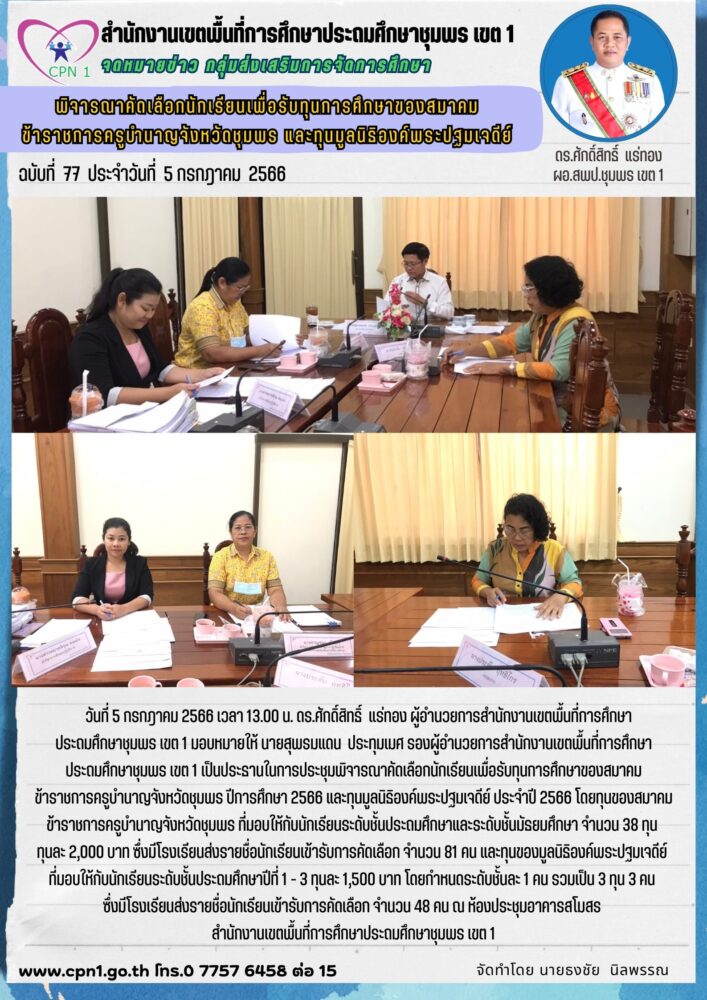 ประชุมพิจารณาคัดเลือกนักเรียนเพื่อรับทุนการศึกษาของสมาคมข้าราชการครูบำนาญจังหวัดชุมพร ปีการศึกษา 2566 และทุนมูลนิธิ
