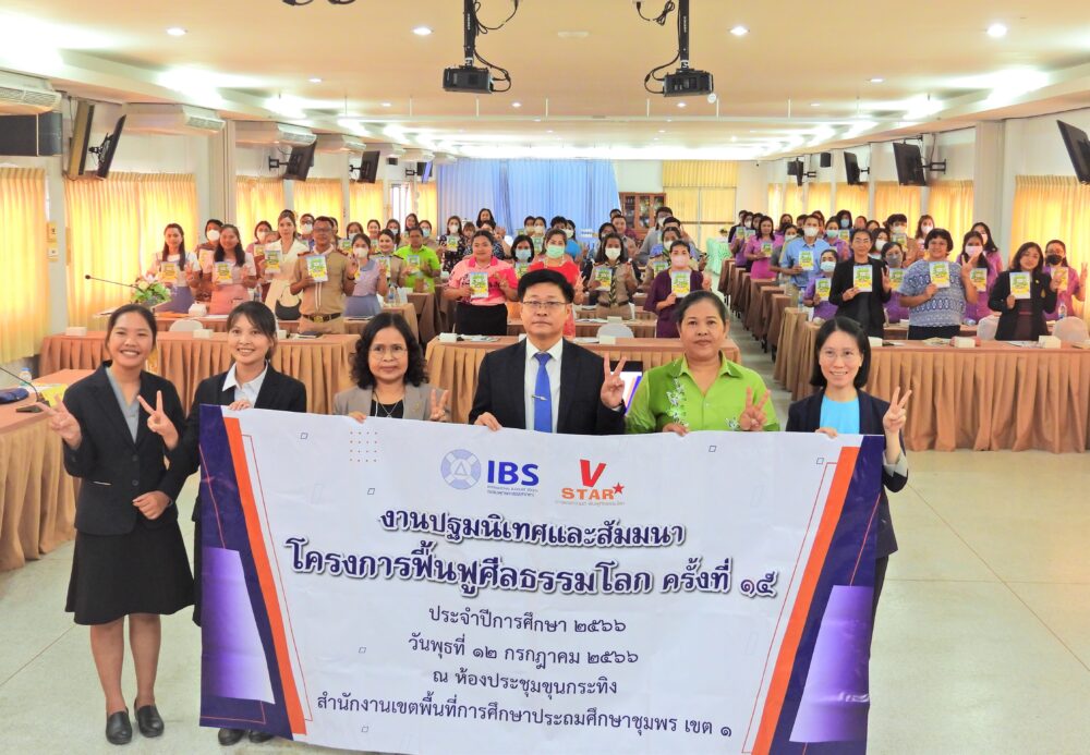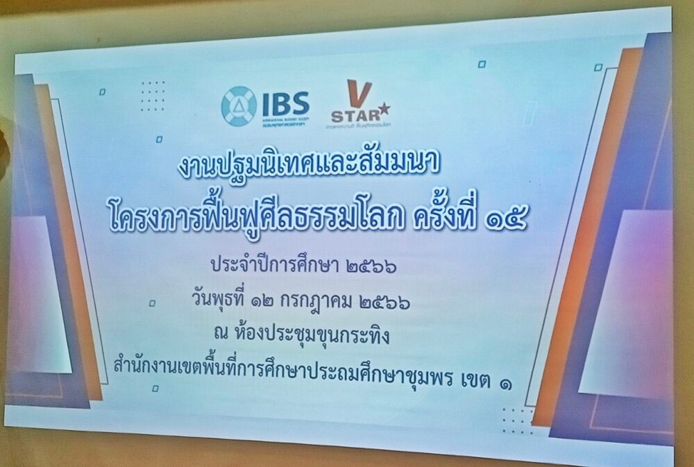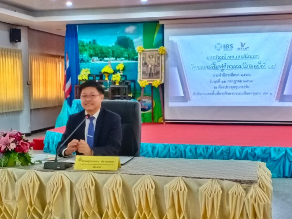 วันพุธที่ 12 กรกฎาคม 2566 ดร.ศักดิ์สิทธิ์ แร่ทอง ผู้อำนวยการสำนักงานเขตพื้นที่การศึกษาประถมศึกษาชุมพร เขต 1 มอบให้นายสุพรมแดน ประทุมเมศ รองผู้อำนวยการสำนักงานเขตพื้นที่การศึกษาประถมศึกษาชุมพร เขต 1 เป็นประธานเปิดการสัมมนาชี้แจง และมอบสื่อการเรียนรู้โครงการฟื้นฟูศีลธรรมโลก (V-Star) ประจำปีการศึกษา 2566 โดยมีนางสาวพีรญา บรรจบลาภ ผู้ประสานงานโครงการฟื้นฟูศีลธรรมโลก จังหวัดชุมพร จากชมรมพุทธศาสตร์สากล เป็นผู้กล่าวรายงาน เพื่อสร้างเยาวชนให้มีความรู้คู่คุณธรรม มีคุณลักษณะอันพึงประสงค์ที่ดี ผ่านกระบวนการเรียนรู้ที่มีระบบ มีการบูรณาการลงสู่กิจวัตรในห้องเรียนและสถานศึกษามีผู้เข้าร่วมสัมมนา จำนวน 90 คน จาก 5 เขตพื้นที่การศึกษาในจังหวัดชุมพรและใกล้เคียง ณ ห้องประชุมขุนกระทิง ชั้น 3 สำนักงานเขตพื้นที่การศึกษาประถมศึกษาชุมพร เขต 1..>>