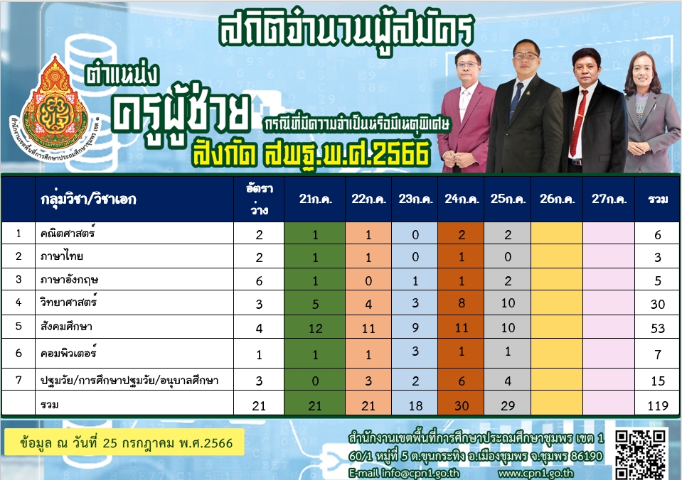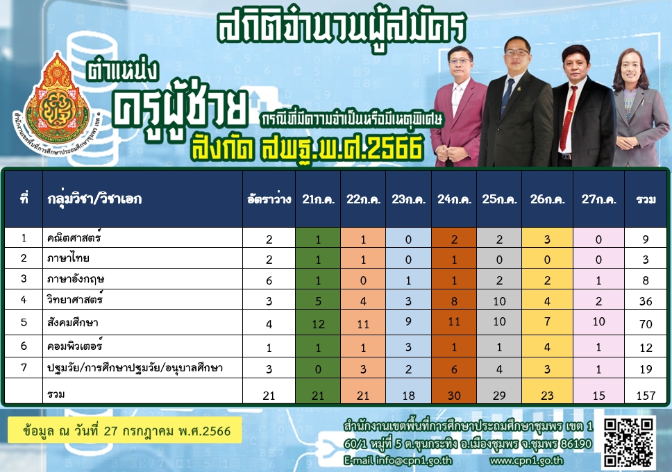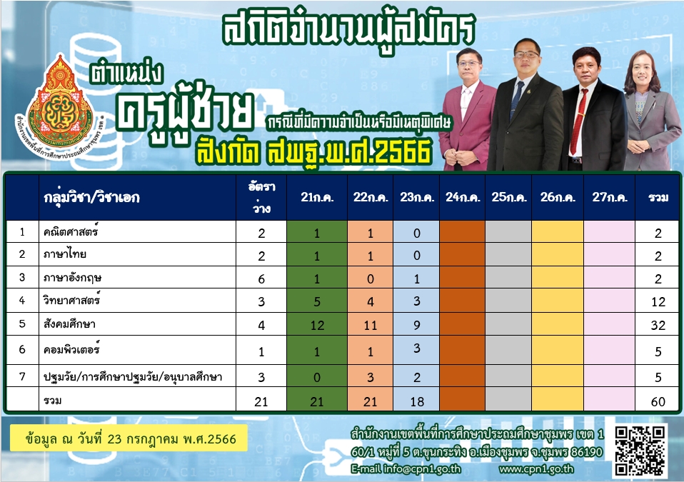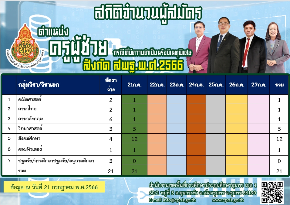 จำนวนผู้สมัครสอบแข่งขันเพื่อบรรจุและแต่งตั้งบุคคลเข้ารับราชการเป็นข้าราชการครูและบุคลากรทางการศึกษา ตำแหน่งครูผู้ช่วย กรณีที่มีความจำเป็นหรือเหตุพิเศษ 21 กรกฎาคม 256628 กรกฎาคม 2023 anawat.n ไม่มีหมวดหมู่ FacebookFacebookXXLINELine anawat.n