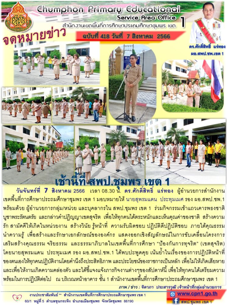 >>.วันจันทร์ที่ 7 สิงหาคม 2566 เวลา 08.30 น. ดร.ศักดิ์สิทธิ์ แร่ทอง ผู้อำนวยการสำนักงานเขตพื้นที่การศึกษาประถมศึกษาชุมพร เขต 1 มอบหมายให้ นายสุพรมแดน ประทุมเมศ รอง ผอ.สพป.ชพ.1 พร้อมด้วย ผู้อำนวยการกลุ่ม/หน่วย และบุคลากรใน สพป.ชุมพร เขต 1 ร่วมกิจกรรมเข้าแถวเคารพธงชาติ บูชาพระรัตนตรัย และกล่าวคำปฏิญญาเขตสุจริต เพื่อให้ทุกคนได้ตระหนักและเห็นคุณค่าของชาติ สร้างความรัก สามัคคีให้เกิดในหน่วยงาน สร้างวินัย รู้หน้าที่ ความรับผิดชอบ ปฏิบัติดีปฏิบัติชอบ ภายใต้คุณธรรมนำความรู้ เพื่อสร้างและรักษาเอกลักษณ์ขององค์กร แสดงออกเชิงสัญลักษณ์ในการขับเคลื่อนโครงการเสริมสร้างคุณธรรม จริยธรรม และธรรมาภิบาลในเขตพื้นที่การศึกษา "ป้องกันการทุจริต" (เขตสุจริต) โดยนายสุพรมแดน ประทุมเมศ รอง ผอ.สพป.ชพ.1 ได้พบปะพูดคุย เน้นย้ำในเรื่องของการปฏิบัติหน้าที่ของตนเองให้ทุกคนปฏิบัติงานโดยคำนึงถึงประสิทธิภาพ และประโยชน์ของราชการเป็นหลัก เพื่อไม่ให้เกิดเสียหายและเพื่อให้งานเกิดความคล่องตัว และได้ชี้แจงแจ้งภารกิจงานต่างๆของสัปดาห์นี้ เพื่อให้ทุกคนได้เตรียมความพร้อมในการปฏิบัติต่อไป ณ บริเวณหน้าอาคาร ชั้น 1 สำนักงานเขตพื้นที่การศึกษาประถมศึกษาชุมพร เขต 1.>>