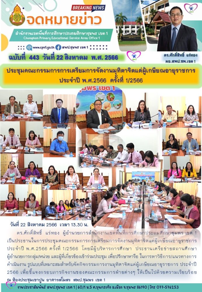 ดร.ศักดิ์สิทธิ์ แร่ทอง ผู้อำนวยการสำนักงานเขตพื้นที่การศึกษาประถมศึกษาชุมพร เขต 1 เป็นประธานในการประชุมคณะกรรมการการเตรียมการจัดงานมุทิตาจิตแด่ผู้เกษียณอายุราชการ ประจำปี พ.ศ.2566 ครั้งที่ 1/2566 โดยมีผู้บริหารการศึกษา ประธานเครือข่ายสถานศึกษา ผู้อำนวยการกลุ่ม/หน่วย และผู้ที่เกี่ยวข้องเข้าร่วมประชุม เพื่อปรึกษาหารือ ในการหาวิธีการ/แนวทางการดำเนินงาน รูปแบบที่เหมาะสมสำหรับจัดกิจกรรมการงานมุทิตาจิตแด่ผู้เกษียณอายุราชการ ประจำปี 2566 เพื่อชี้แจงกรอบภารกิจงานของคณะกรรมการฝ่ายต่างๆ ให้เป็นไปด้วยความเรียบร้อย ณ ห้องประชุมเขาปูน อาคารสโมสร สพป.ชุมพร เขต 1