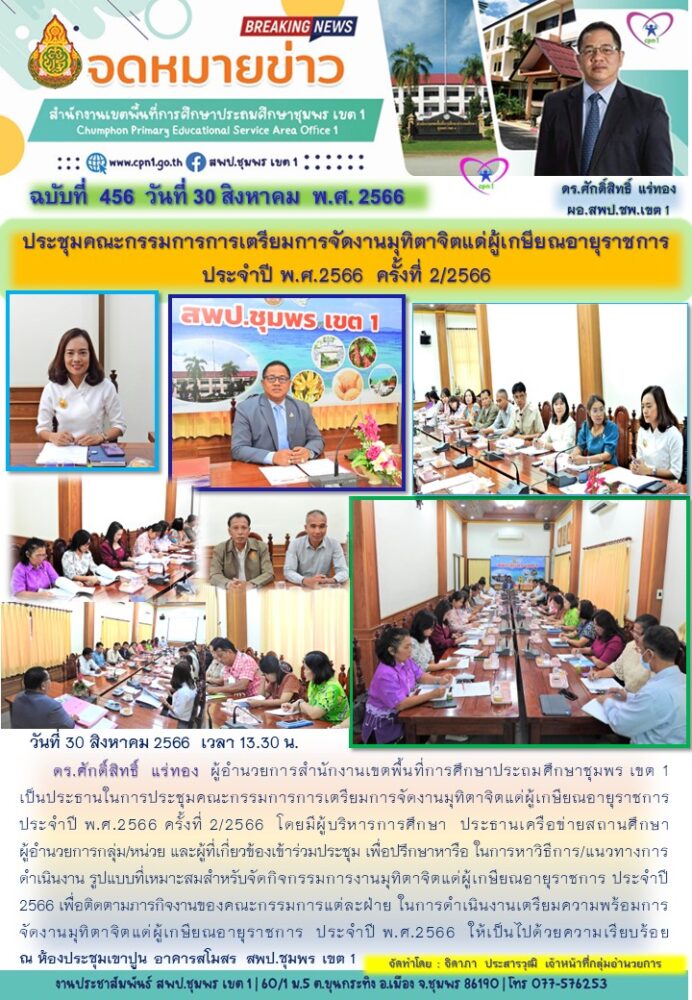 >>>ดร.ศักดิ์สิทธิ์ แร่ทอง ผู้อำนวยการสำนักงานเขตพื้นที่การศึกษาประถมศึกษาชุมพร เขต 1 เป็นประธานในการประชุมคณะกรรมการการเตรียมการจัดงานมุทิตาจิตแด่ผู้เกษียณอายุราชการ ประจำปี พ.ศ.2566 ครั้งที่ 2/2566 โดยมีผู้บริหารการศึกษา ประธานเครือข่ายสถานศึกษา ผู้อำนวยการกลุ่ม/หน่วย และผู้ที่เกี่ยวข้องเข้าร่วมประชุม เพื่อปรึกษาหารือ ในการหาวิธีการ/แนวทางการดำเนินงาน รูปแบบที่เหมาะสมสำหรับจัดกิจกรรมการงานมุทิตาจิตแด่ผู้เกษียณอายุราชการ ประจำปี 2566 เพื่อติดตามภารกิจงานของคณะกรรมการแต่ละฝ่าย ในการดำเนินงานเตรียมความพร้อมจัดงานมุทิตาจิตแด่ผู้เกษียณอายุราชการ ประจำปี พ.ศ.2566 ให้เป็นไปด้วยความเรียบร้อย ณ ห้องประชุมเขาปูน อาคารสโมสร สพป.ชุมพร เขต 1.>>