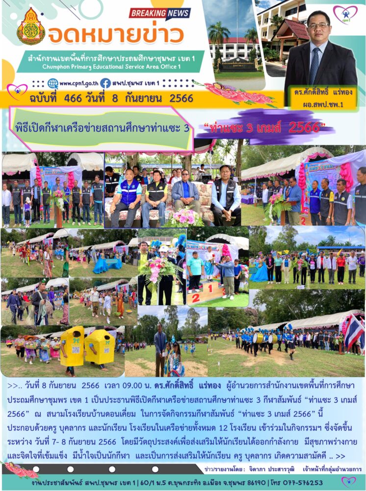 >>.วันที่ 8 กันยายน 2566 เวลา 09.00 น. ดร.ศักดิ์สิทธิ์ แร่ทอง ผู้อำนวยการสำนักงานเขตพื้นที่การศึกษาประถมศึกษาชุมพร เขต 1 เป็นประธานพิธีเปิดกีฬาเครือข่ายสถานศึกษาท่าแซะ 3 กีฬาสัมพันธ์ "ท่าแซะ 3 เกมส์ 2566" ณ สนามโรงเรียนบ้านดอนเคี่ยม ในการจัดกิจกรรมกีฬาสัมพันธ์ "ท่าแซะ 3 เกมส์ 2566" นี้ประกอบด้วยครู บุคลากร และนักเรียน โรงเรียนในเครือข่ายทั้งหมด 12 โรงเรียน เข้าร่วมในกิจกรรมฯ ซึ่งจัดขึ้นระหว่าง วันที่ 7- 8 กันยายน 2566 โดยมีวัตถุประสงค์เพื่อส่งเสริมให้นักเรียนได้ออกกำลังกาย มีสุขภาพร่างกายและจิตใจที่เข้มแข็ง มีน้ำใจเป็นนักกีฬา และเป็นการส่งเสริมให้นักเรียน ครู บุคลากร เกิดความสามัคคี. >>