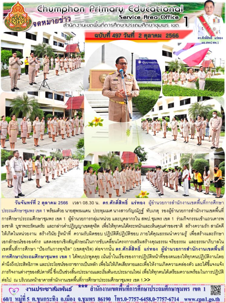 วันจันทร์ที่ 2 ตุลาคม 2566 เวลา 08.30 น. ดร.ศักดิ์สิทธิ์ แร่ทอง ผู้อำนวยการสำนักงานเขตพื้นที่การศึกษาประถมศึกษาชุมพร เขต 1 พร้อมด้วย นายสุพรมแดน ประทุมเมศ นางสาวกัญณัฏฐ์ ทับเกตุ รองผู้อำนวยการสำนักงานเขตพื้นที่การศึกษาประถมศึกษาชุมพร เขต 1 ผู้อำนวยการกลุ่ม/หน่วย และบุคลากรใน สพป.ชุมพร เขต 1 ร่วมกิจกรรมเข้าแถวเคารพธงชาติ บูชาพระรัตนตรัย และกล่าวคำปฏิญญาเขตสุจริต เพื่อให้ทุกคนได้ตระหนักและเห็นคุณค่าของชาติ สร้างความรัก สามัคคีให้เกิดในหน่วยงาน สร้างวินัย รู้หน้าที่ ความรับผิดชอบ ปฏิบัติดีปฏิบัติชอบ ภายใต้คุณธรรมนำความรู้ เพื่อสร้างและรักษาเอกลักษณ์ขององค์กร แสดงออกเชิงสัญลักษณ์ในการขับเคลื่อนโครงการเสริมสร้างคุณธรรม จริยธรรม และธรรมาภิบาลในเขตพื้นที่การศึกษา "ป้องกันการทุจริต" (เขตสุจริต) ต่อจากนั้น ดร.ศักดิ์สิทธิ์ แร่ทอง ผู้อำนวยการสำนักงานเขตพื้นที่การศึกษาประถมศึกษาชุมพร เขต 1 ได้พบปะพูดคุย เน้นย้ำในเรื่องของการปฏิบัติหน้าที่ของตนเองให้ทุกคนปฏิบัติงานโดยคำนึงถึงประสิทธิภาพ และประโยชน์ของราชการเป็นหลัก เพื่อไม่ให้เกิดเสียหายและเพื่อให้งานเกิดความคล่องตัว และได้ชี้แจงแจ้งภารกิจงานต่างๆของสัปดาห์นี้ ซึ่งเป็นช่วงสิ้นงประมาณและเริ่มต้นงบประมาณใหม่ เพื่อให้ทุกคนได้เตรียมความพร้อมในการปฏิบัติต่อไป ณ บริเวณหน้าอาคารสำนักงานเขตพื้นที่การศึกษาประถมศึกษาชุมพร เขต 1.>>