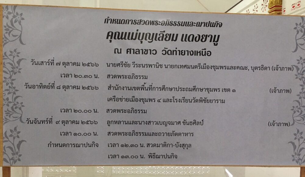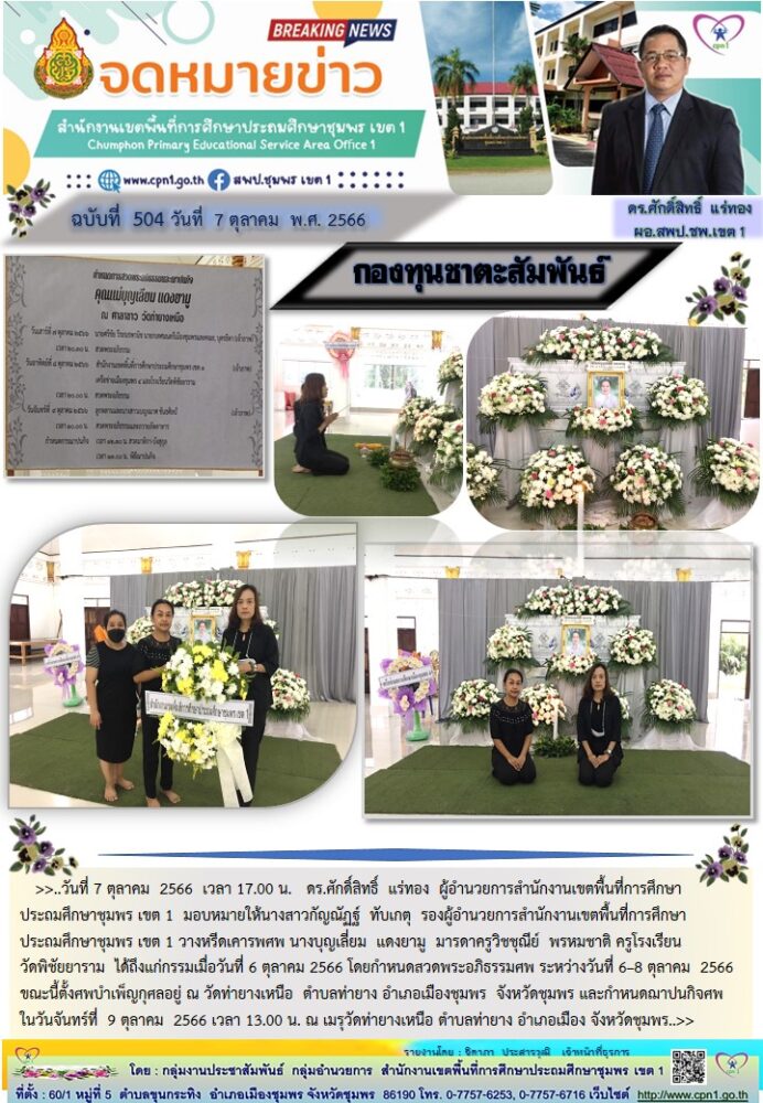 …วันที่ 7 ตุลาคม 2566 เวลา 17.00 น. ดร.ศักดิ์สิทธิ์ แร่ทอง ผู้อำนวยการสำนักงานเขตพื้นที่การศึกษาประถมศึกษาชุมพร เขต 1 มอบหมายให้นางสาวกัญณัฏฐ์ ทับเกตุ รองผู้อำนวยการสำนักงานเขตพื้นที่การศึกษาประถมศึกษาชุมพร เขต 1 วางหรีดเคารพศพ นางบุญเลี่ยม แดงยามู มารดาครูวิชชุณีย์ พรหมชาติ ครูโรงเรียนวัดพิชัยยาราม ได้ถึงแก่กรรมเมื่อวันที่ 6 ตุลาคม 2566 โดยกำหนดสวดพระอภิธรรมศพ ระหว่างวันที่ 6–8 ตุลาคม 2566 ขณะนี้ตั้งศพบำเพ็ญกุศลอยู่ ณ วัดท่ายางเหนือ ตำบลท่ายาง อำเภอเมืองชุมพร จังหวัดชุมพร และกำหนดฌาปนกิจศพ ในวันจันทร์ที่ 9 ตุลาคม 2566 เวลา 13.00 น. ณ เมรุวัดท่ายางเหนือ ตำบลท่ายาง อำเภอเมือง จังหวัดชุมพร..>>