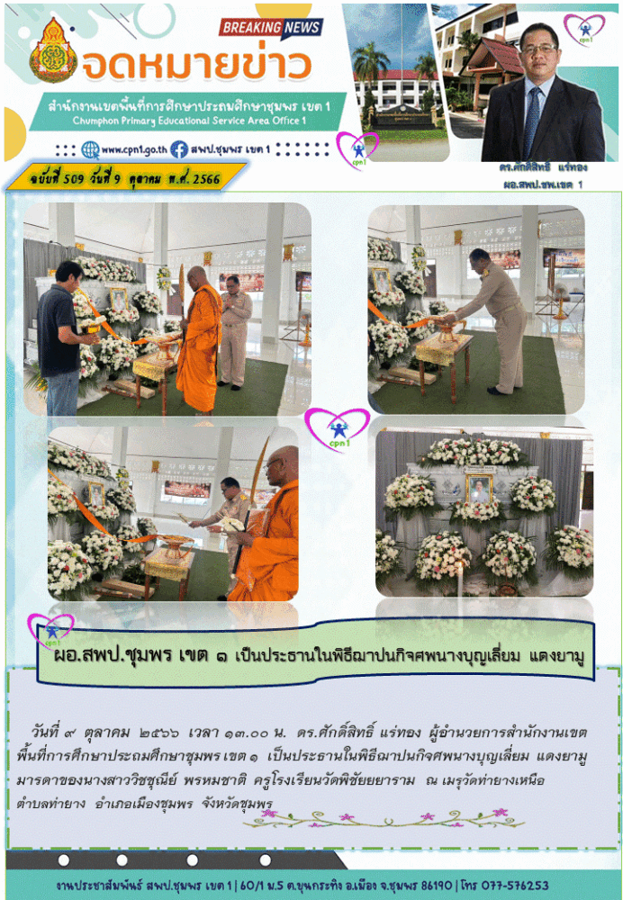 >>วันที่ 9 ตุลาคม 2566 เวลา 13.00 น. ดร.ศักดิ์สิทธิ์ แร่ทอง ผู้อำนวยการสำนักงานเขตพื้นที่การศึกษาประถมศึกษาชุมพร เขต ๑ เป็นประธานในพิธีฌาปนกิจศพนางบุญเลี่ยม แดงยามู มารดาของนางสาววิชชุณีย์ พรหมชาติ ครูโรงเรียนวัดพิชัยยยาราม ณ เมรุวัดท่ายางเหนือ ตำบลท่ายาง อำเภอเมืองชุมพร จังหวัดชุมพร.>>