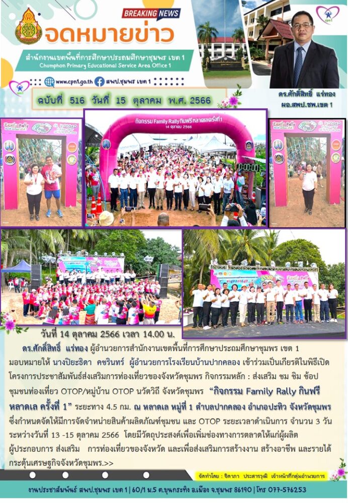 ดร.ศักดิ์สิทธิ์ แร่ทอง ผู้อำนวยการสำนักงานเขตพื้นที่การศึกษาประถมศึกษาชุมพร เขต 1 มอบหมายให้ นางปิยะธิดา คชรินทร์ ผู้อำนวยการโรงเรียนบ้านปากคลอง เข้าร่วมเป็นเกียรติในพิธีเปิดโครงการประชาสัมพันธ์ส่งเสริมการท่องเที่ยวของจังหวัดชุมพร กิจกรรมหลัก : ส่งเสริม ชม ชิม ช้อป ชุมชนท่องเที่ยว OTOP/หมู่บ้าน OTOP นวัตวิถี จังหวัดชุมพร "กิจกรรม Family Rally กินฟรี หลาดเล ครั้งที่ 1" ระยะทาง 4.5 กม. ณ หลาดเล หมู่ที่ 1 ตำบลปากคลอง อำเภอปะทิว จังหวัดชุมพร ซึ่งกำหนดจัดให้มีการจัดจำหน่ายสินค้าผลิตภัณฑ์ชุมชน และ OTOP ระยะเวลาดำเนินการ จำนวน 3 วัน ระหว่างวันที่ 13 –15 ตุลาคม 2566 โดยมีวัตถุประสงค์เพื่อเพิ่มช่องทางการตลาดให้แก่ผู้ผลิต ผู้ประกอบการ ส่งเสริมการท่องเที่ยวของจังหวัด และเพื่อส่งเสริมการสร้างงาน สร้างอาชีพ และรายได้ กระตุ้นเศรษฐกิจจังหวัดชุมพร.>>