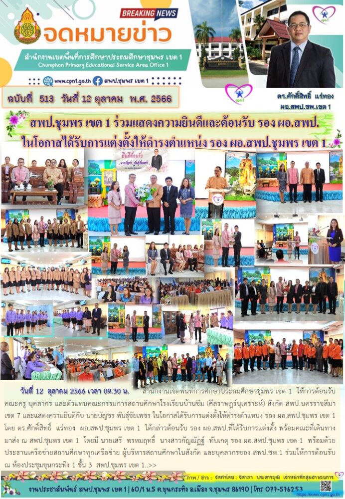 สพป.ชุมพร เขต 1 ร่วมแสดงความยินดีและต้อนรับ รอง ผอ.สพป. ในโอกาสได้รับการแต่งตั้งให้ดำรงตำแหน่ง รอง ผอ.สพป.ชุมพร เขต 1