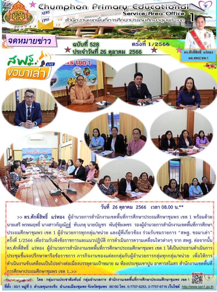>> ดร.ศักดิ์สิทธิ์ แร่ทอง ผู้อำนวยการสำนักงานเขตพื้นที่การศึกษาประถมศึกษาชุมพร เขต 1 พร้อมด้วย นายเสรี พรหมฤทธิ์ นางสาวกัญณัฏฐ์ ทับเกตุ นายบัญชร พันธุ์ชัยเพชร รองผู้อำนวยการสำนักงานเขตพื้นที่การศึกษาประถมศึกษาชุมพร เขต 1 ผู้อำนวยการทุกกลุ่ม/หน่วย และผู้ที่เกี่ยวข้อง ร่วมรับชมรายการ "สพฐ. ขอมาเล่า" ครั้งที่ 1/2566 เพื่อร่วมรับฟังข้อราชการและแนวปฏิบัติ การดำเนินการความเคลื่อนไหวต่างๆ จาก สพฐ. ต่อจากนั้น ดร.ศักดิ์สิทธิ์ แร่ทอง ผู้อำนวยการสำนักงานเขตพื้นที่การศึกษาประถมศึกษาชุมพร เขต 1 ได้เป็นประธานดำเนินการประชุมชี้แจงปรึกษาหารือข้อราชการ ภารกิจงานของแต่ละกลุ่มกับผู้อำนวยการกลุ่มทุกกลุ่ม/หน่วย เพื่อให้การดำเนินงานขับเคลื่อนเป็นไปอย่างต่อเนื่องบรรลุตามเป้าหมาย ณ ห้องประชุมเขาปูน อาคารสโมสร สำนักงานเขตพื้นที่การศึกษาประถมศึกษาชุมพร เขต 1..>>