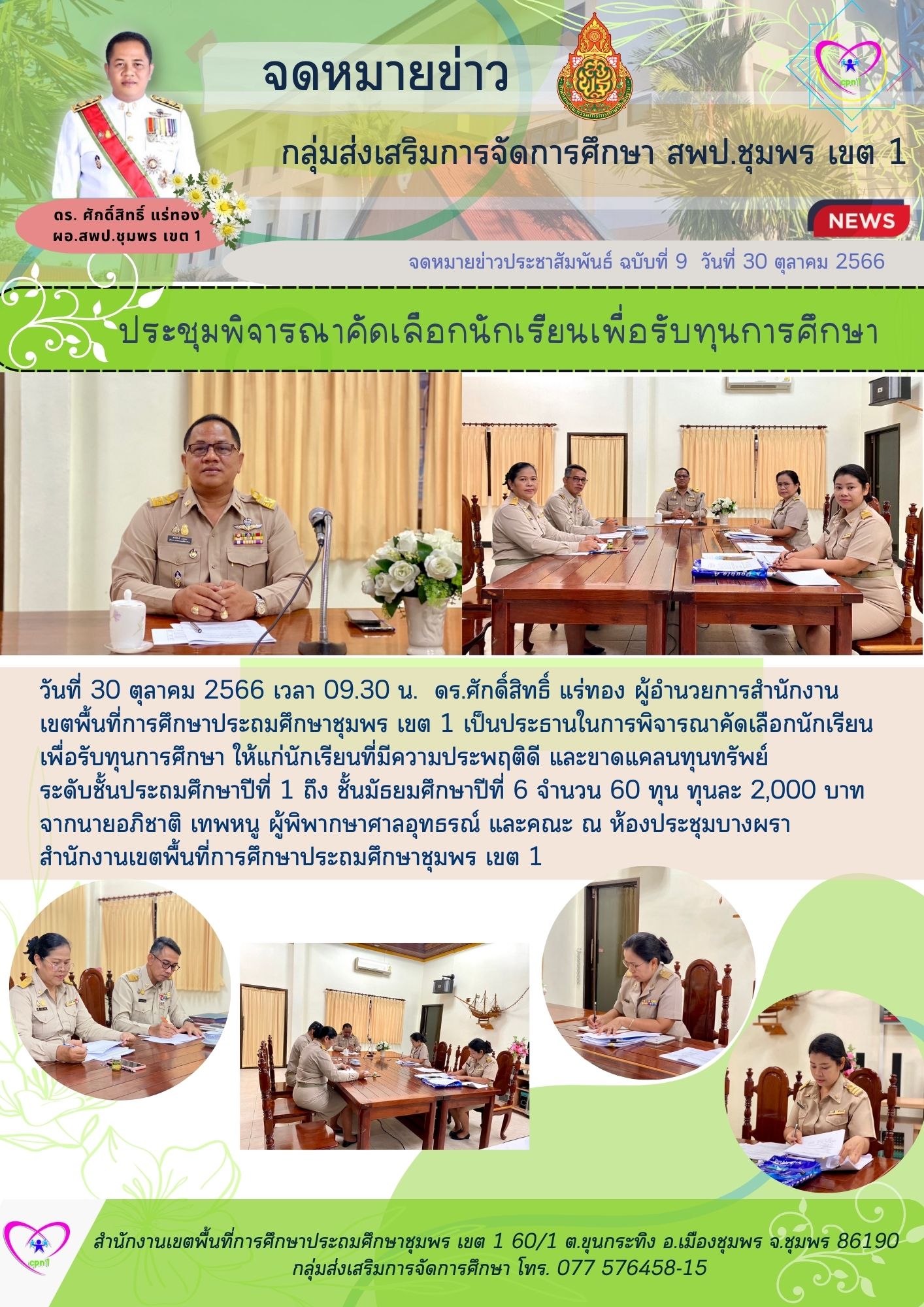 วันที่ 30 ตุลาคม 2566 เวลา 09.30 น. ดร.ศักดิ์สิทธิ์ แร่ทอง ผู้อำนวยการสำนักงานเขตพื้นที่การศึกษาประถมศึกษาชุมพร เขต 1 เป็นประธานในการพิจารณาคัดเลือกนักเรียนเพื่อรับทุนการศึกษา ให้แก่นักเรียนที่มีความประพฤติดี และขาดแคลนทุนทรัพย์ ระดับชั้นประถมศึกษาปีที่ 1 ถึง ชั้นมัธยมศึกษาปีที่ 6 จำนวน 60 ทุน ทุนละ 2,000 บาท จากนายอภิชาติ เทพหนู ผู้พิพากษาศาลอุทธรณ์ และคณะ ณ ห้องประชุมบางผรา สำนักงานเขตพื้นที่การศึกษาประถมศึกษาชุมพร เขต 1