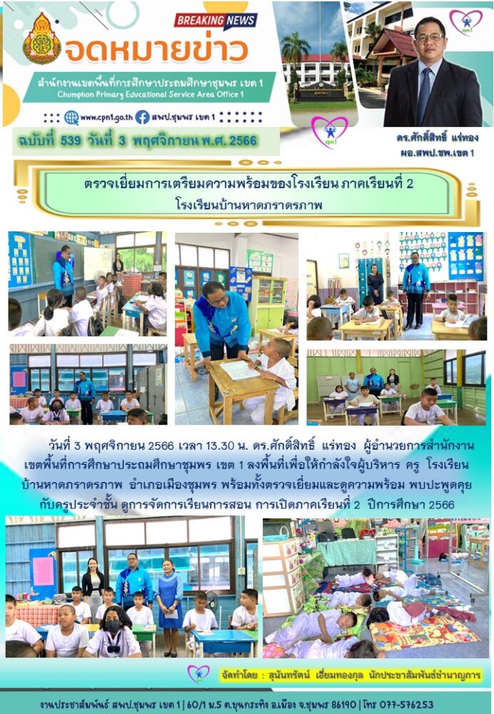 วันที่ 3 พฤศจิกายน 2566 เวลา 13.30 น. ดร.ศักดิ์สิทธิ์ แร่ทอง ผู้อำนวยการสำนักงานเขตพื้นที่การศึกษาประถมศึกษาชุมพร เขต 1 ลงพื้นที่เพื่อให้กำลังใจผู้บริหาร ครู โรงเรียนบ้านหาดภราดรภาพ อำเภอเมืองชุมพร พร้อมทั้งตรวจเยี่ยมและดูความพร้อม พบปะพูดคุยกับครูประจำชั้น ดูการจัดการเรียนการสอน การเปิดภาคเรียนที่ 2 ปีการศึกษา 2566