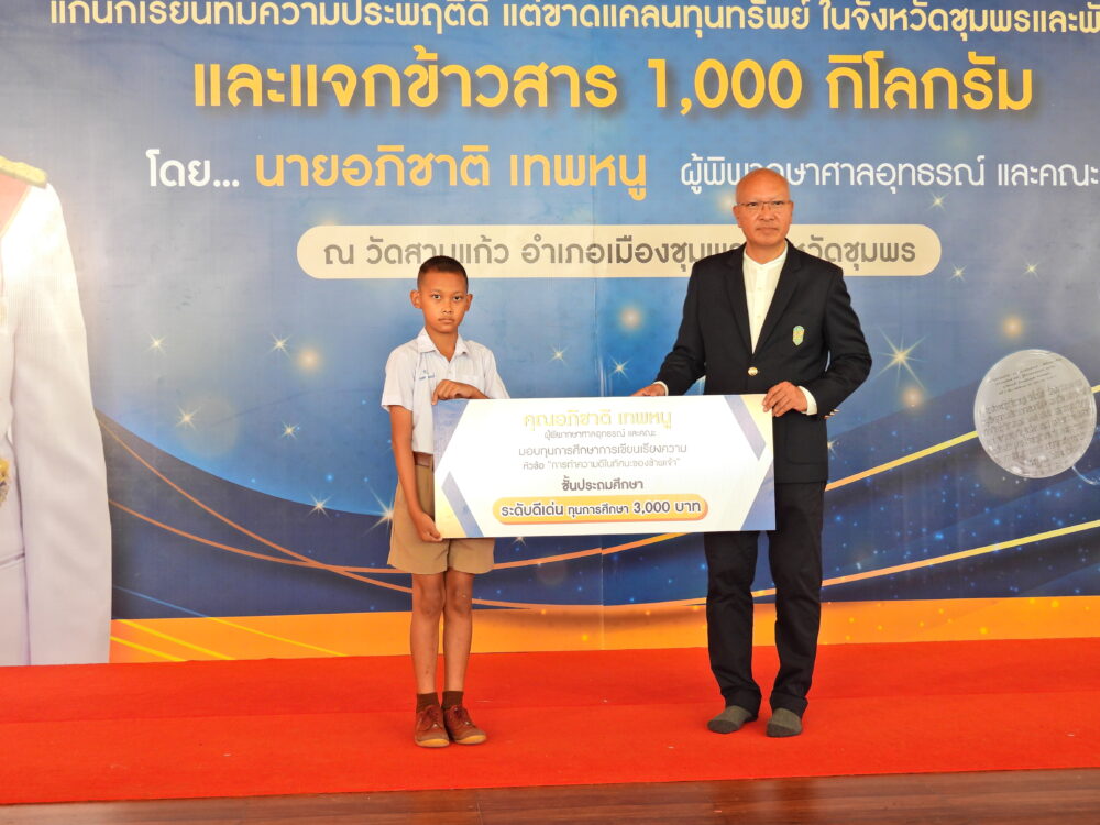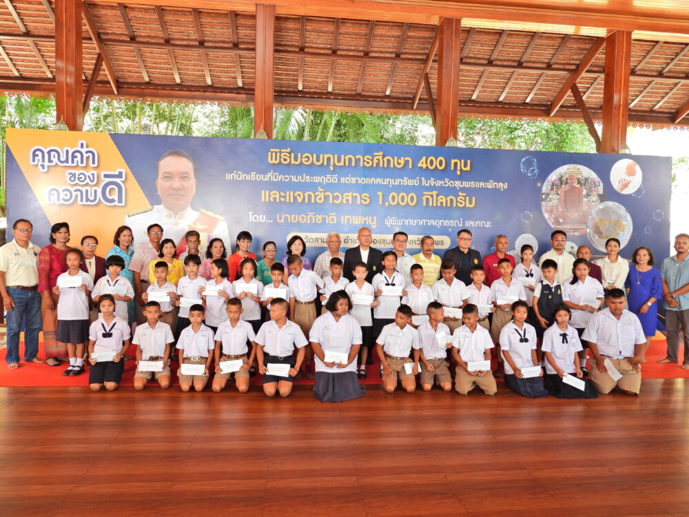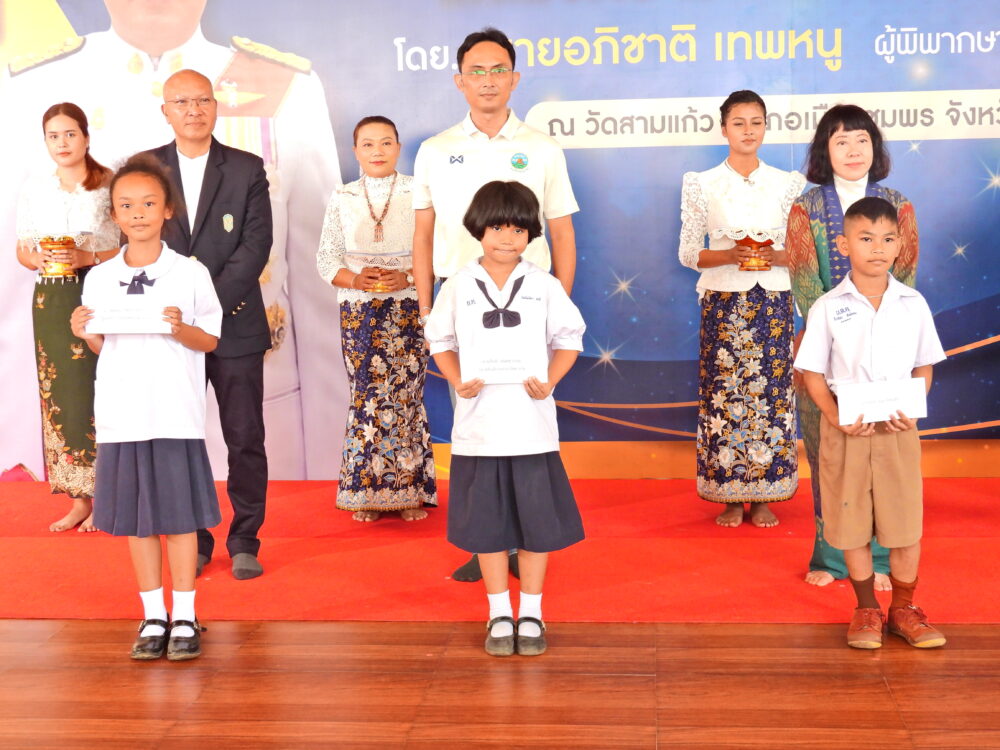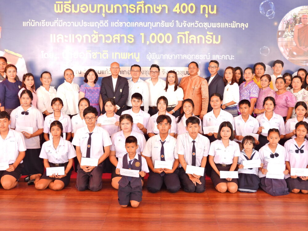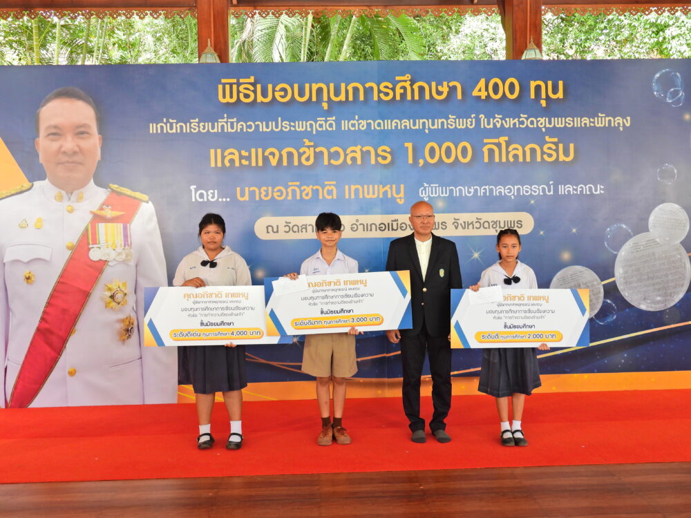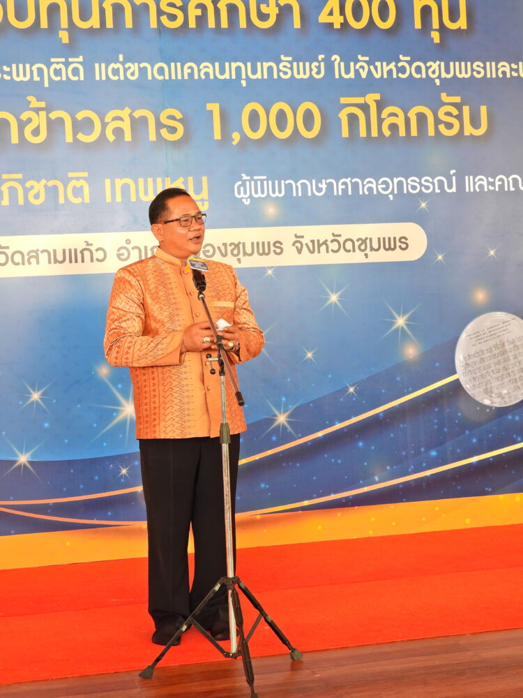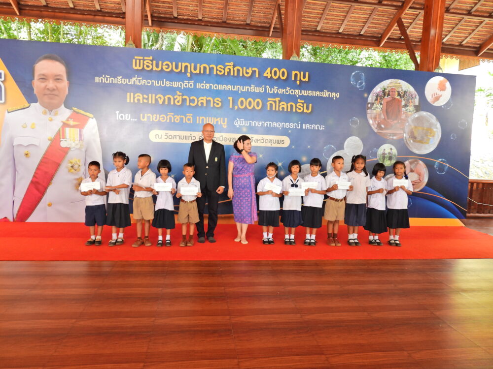 พิธีมอบทุนการศึกษา 400 ทุนแก่นักเรียนที่มีความประพฤติดีแต่ขาดแคลนทุนทรัพย์ โดยนายอภิชาติ เทพหนู ผู้พิพากษาศาลอุทธรณ์ และคณะ วันที่ 5 พฤศจิกายน 2566 ณ วัดสามแก้ว อ.เมือง จ.ชุมพร