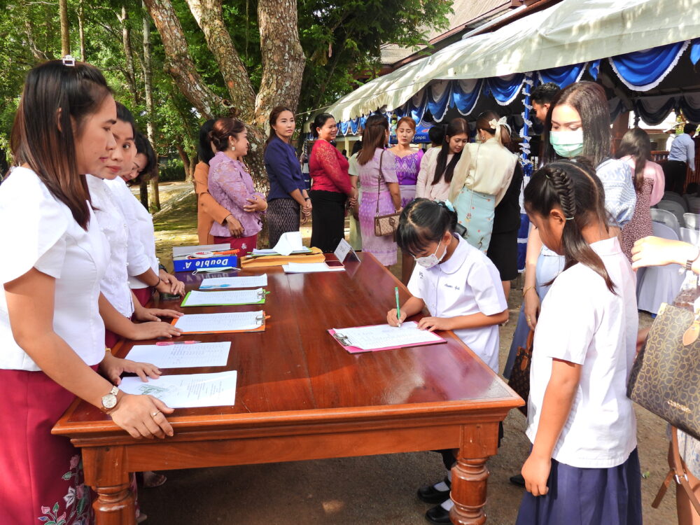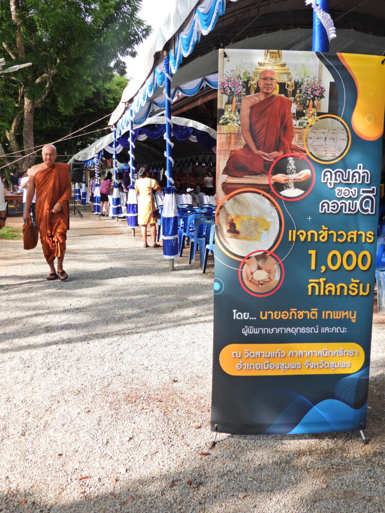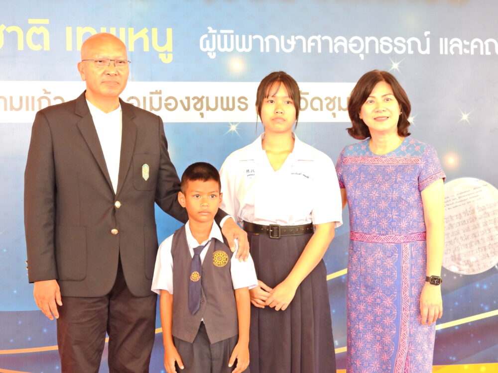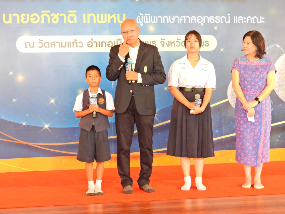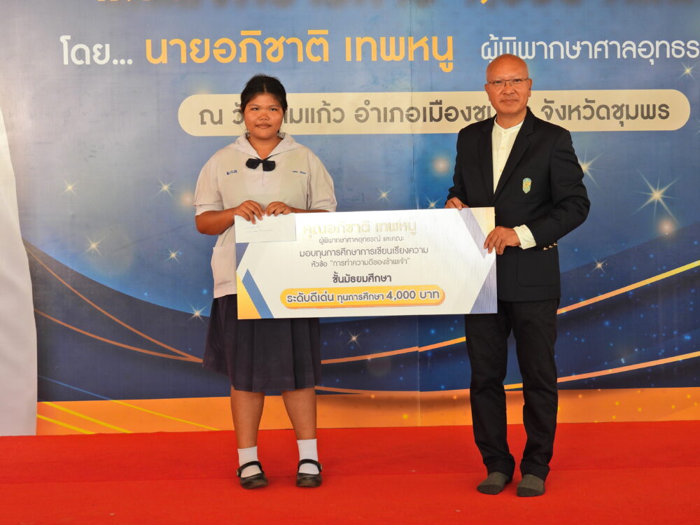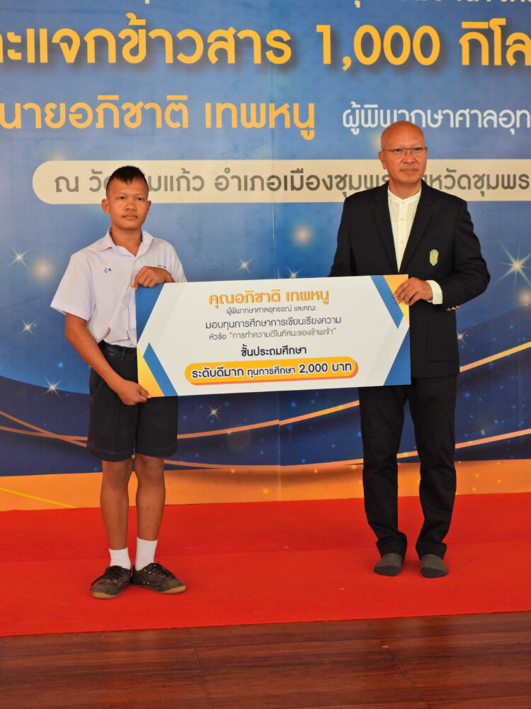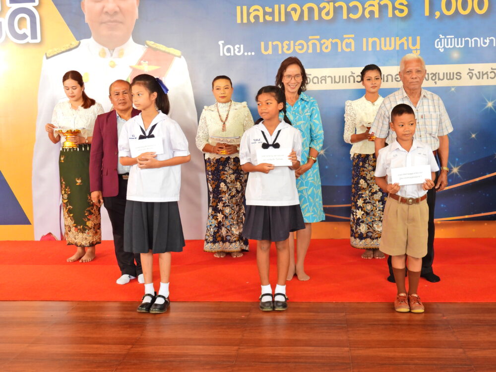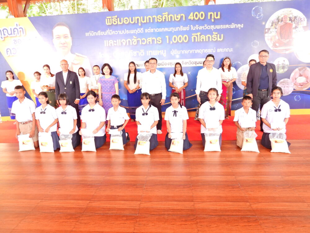 พิธีมอบทุนการศึกษา 400 ทุนแก่นักเรียนที่มีความประพฤติดีแต่ขาดแคลนทุนทรัพย์ โดยนายอภิชาติ เทพหนู ผู้พิพากษาศาลอุทธรณ์ และคณะ วันที่ 5 พฤศจิกายน 2566 ณ วัดสามแก้ว อ.เมือง จ.ชุมพร