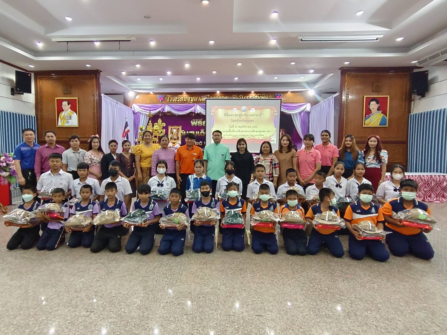 จุดที่ 1 ณ โรงเรียนอนุบาลปะทิว (บางสนพิพิธราษฎร์บำรุง) อำเภอปะทิว มีโรงเรียนเข้ารับมอบ