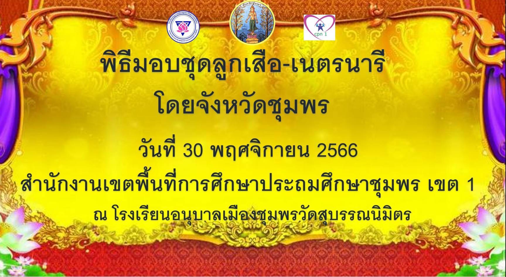 ดร.ศักดิ์สิทธิ์ แร่ทอง ผู้อำนวยการสำนักงานเขตพื้นที่การศึกษาประถมศึกษาชุมพร เขต 1 มอบหมายให้ นายเสรี พรหมฤทธิ์ รองผู้อำนวยการสำนักงานเขตพื้นที่การศึกษาประถมศึกษาชุมพร เขต 1