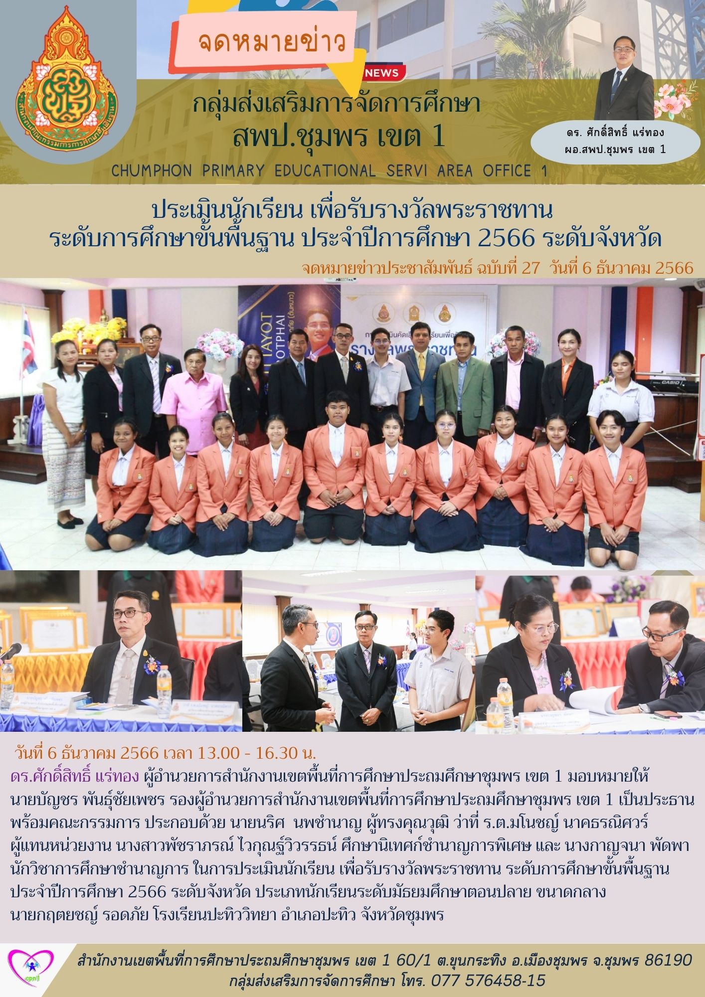 ดร.ศักดิ์สิทธิ์ แร่ทอง ผู้อำนวยการสำนักงานเขตพื้นที่การศึกษาประถมศึกษาชุมพร เขต 1 มอบหมายให้