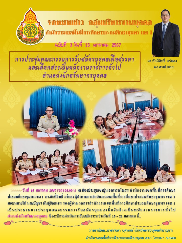 ประชุมคณะกรรมการรับสมัครบุคคลเพื่อสรรหาและเลือกสรรเป็นพนักงานราชการทั่วไป ตำแหน่งนักทรัพยากรบุคคล สังกัดสำนักงานเขตพื้นที่การศึกษาประถมศึกษาชุมพร เขต 1 15 มกราคม 256715 มกราคม 2024 กลุ่มบริหารงานบุคคล สพป.ชพ.1 ข่าวและกิจกรรม สพป.ชพ.1, ข่าวและกิจกรรมกลุ่มบริหารงานบุคคล FacebookFacebookXXLINELine กลุ่มบริหารงานบุคคล สพป.ชพ.1