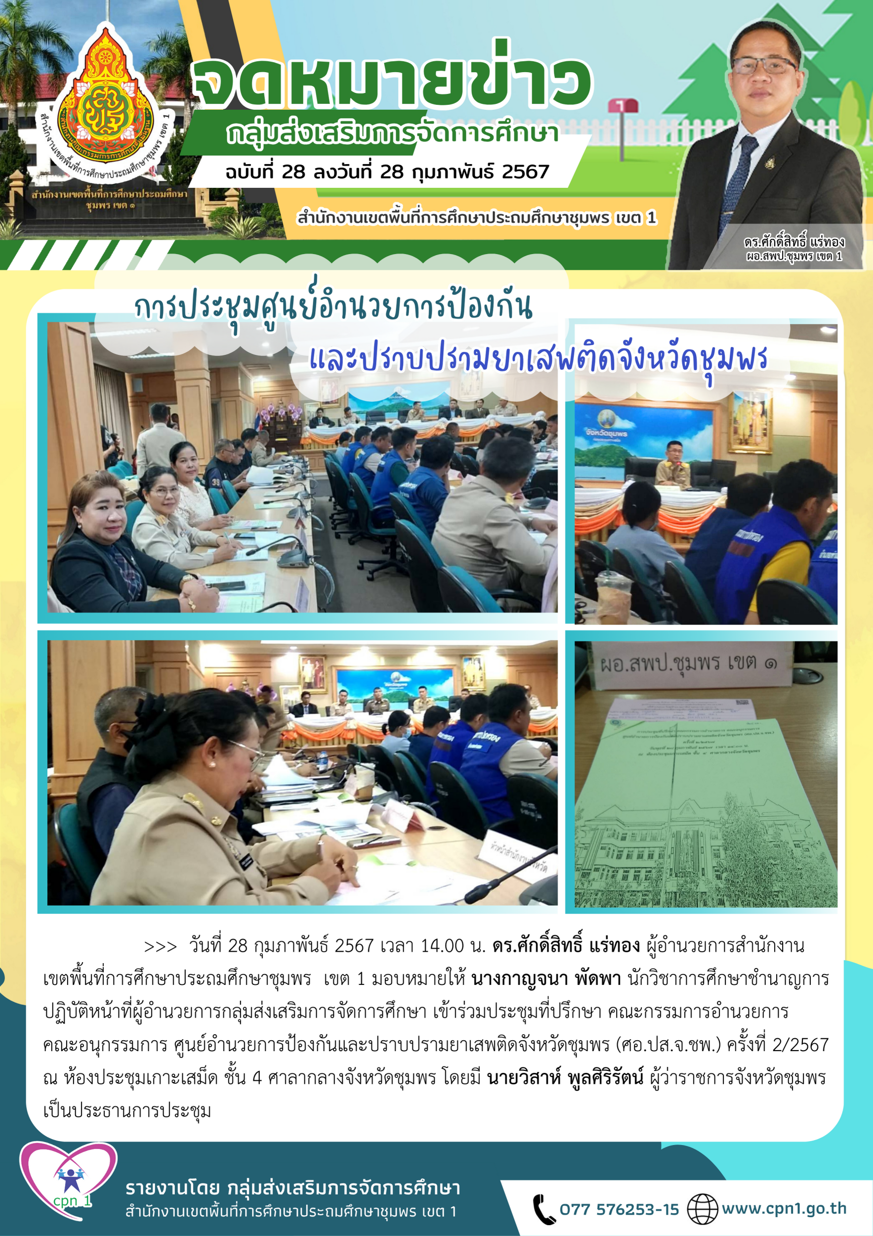 >>>> วันที่ 28 กุมภาพันธ์ 2567 เวลา 14.00 น. ดร.ศักดิ์สิทธิ์ แร่ทอง ผู้อำนวยการสำนักงานเขตพื้นที่การศึกษาประถมศึกษาชุมพร เขต 1 มอบหมายให้ นางกาญจนา พัดพา นักวิชาการศึกษาชำนาญการ ปฏิบัติหน้าที่ผู้อำนวยการกลุ่มส่งเสริมการจัดการศึกษา เข้าร่วมประชุมที่ปรึกษา คณะกรรมการอำนวยการ คณะอนุกรรมการ ศูนย์อำนวยการป้องกันและปราบปรามยาเสพติดจังหวัดชุมพร (ศอ.ปส.จ.ชพ.) ครั้งที่ 2/2567 ณ ห้องประชุมเกาะเสม็ด ชั้น 4 ศาลากลางจังหวัดชุมพร โดยมี นายวิสาห์ พูลศิริรัตน์ ผู้ว่าราชการจังหวัดชุมพร เป็นประธานการประชุม