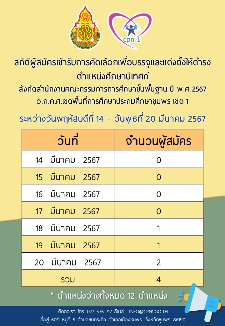 สถิติจำนวนผู้สมัครเข้ารับการคัดเลือกบุคคลเพื่อบรรจุและแต่งตั้งให้ดำรงตำแหน่งศึกษานิเทศก์ สังกัดสำนักงานคณะกรรมการการศึกษาขั้นพื้นฐาน ปี พ.ศ.2567 14 มีนาคม 256720 มีนาคม 2024 กลุ่มบริหารงานบุคคล สพป.ชพ.1 ข่าวและกิจกรรม สพป.ชพ.1, ข่าวและกิจกรรมกลุ่มบริหารงานบุคคล FacebookFacebookXXLINELine กลุ่มบริหารงานบุคคล สพป.ชพ.1