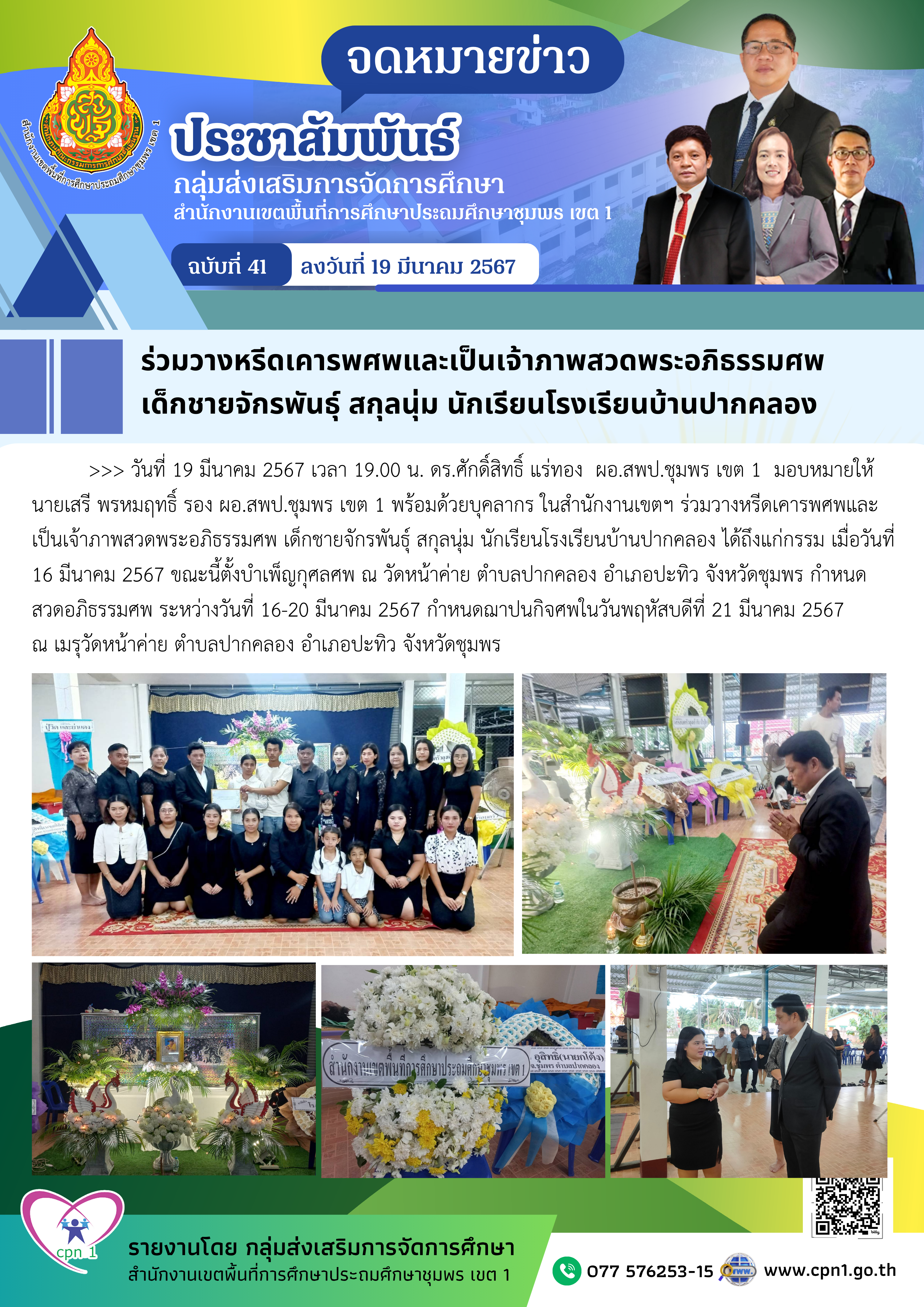 >>> วันที่ 19 มีนาคม 2567 เวลา 19.00 น. ดร.ศักดิ์สิทธิ์ แร่ทอง ผอ.สพป.ชุมพร เขต 1 มอบหมายให้ นายเสรี พรหมฤทธิ์ รอง ผอ.สพป.ชุมพร เขต 1 พร้อมด้วยบุคลากร ในสำนักงานเขตฯ ร่วมวางหรีดเคารพศพและเป็นเจ้าภาพสวดพระอภิธรรมศพ เด็กชายจักรพันธุ์ สกุลนุ่ม นักเรียนโรงเรียนบ้านปากคลอง ได้ถึงแก่กรรม เมื่อวันที่ 16 มีนาคม 2567 พร้อมทั้ง มอบเงินช่วยเหลือจากกองทุนช่วยเหลือนักเรียนครูและบุคลากรทางการศึกษาผู้ประสบภัยฯ จำนวน 3,000 บาท ให้กับครอบครัวของนักเรียน ขณะนี้ตั้งบำเพ็ญกุศลศพ ณ วัดหน้าค่าย ตำบลปากคลอง อำเภอปะทิว จังหวัดชุมพร กำหนดสวดอภิธรรมศพ ระหว่างวันที่ 16-20 มีนาคม 2567 กำหนดฌาปนกิจศพในวันพฤหัสบดีที่ 21 มีนาคม 2567 ณ เมรุวัดหน้าค่าย ตำบลปากคลอง อำเภอปะทิว จังหวัดชุมพร